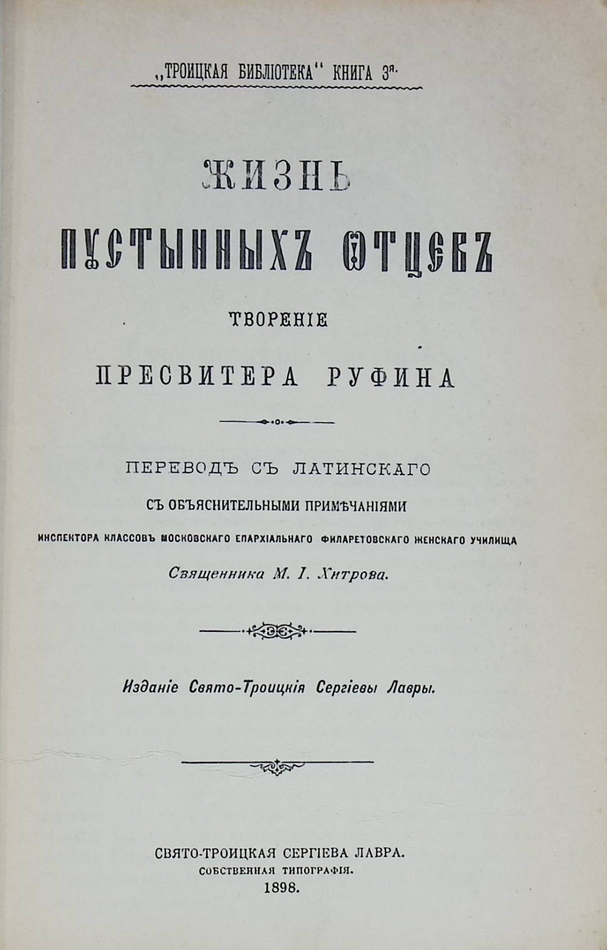 Жизнь пустынныхъ отцевъ. Творение пресвитера Руфина (Репринтное воспроизведение издания 1898 г)