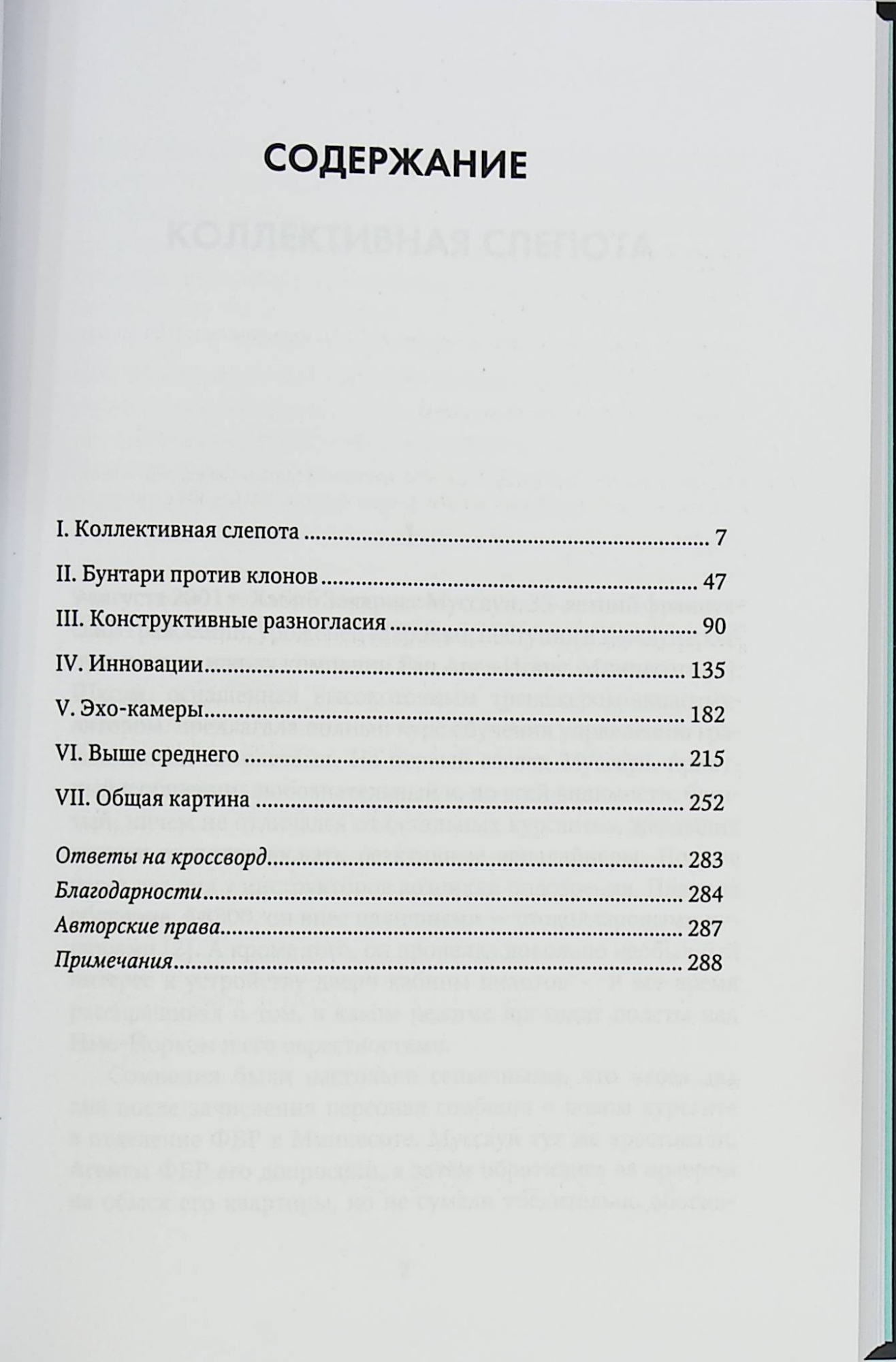 Эффективное мышление — одна из главных тем, которая объединяет бестселлеры британского журналиста Мэтью Сайеда, в прошлом первой ракетки в настольном теннисе и троекратного чемпиона Содружества. В его новой книге увлекательно изложены главные принципы командной работы в свете последних достижений психологии, экономики, антропологии и генетики. Автор разбирает ряд поучительных примеров, среди которых как истории успеха, так и крупные неудачи, и дает советы, помогающие укрепить командное мышление, идет ли речь о компании, учреждении или команде друзей. Книга бросает вызов иерархиям, поощряет конструктивные разногласия и заставляет нас задуматься об источнике лучших идей.«Наше путешествие заведет нас в самые неожиданные места: в «зону смерти» на вершине горы Эверест и в Африку к югу от Сахары в эпоху зарождения нашего вида. Мы узнаем, почему в начале 1950-х в военно-воздушных силах США было так много катастроф, как голландцы заново изобрели футбол и почему большая часть диет почти никому не подходит. Мы проанализируем истории успеха, отбросив внешние обстоятельства и изучив их внутреннюю логику. Мы рассмотрим и провалы, последствия которых оказались очень плодотворными. Зачастую именно выяснение причин неудачи может стать самым ярким маяком и направить на верный путь. К концу книги мы уже по-новому посмотрим на то, как достигается успех, и этот взгляд пригодится не только в управлении государством и в бизнесе — он будет полезен нам всем. Использование возможностей когнитивного разнообразия — вот в чем заключен главный источник конкурентного преимущества и надежный путь к обновлению и развитию». (Мэтью Сайед)