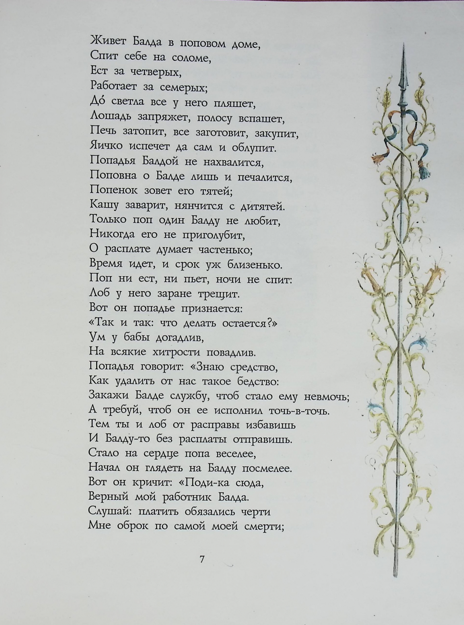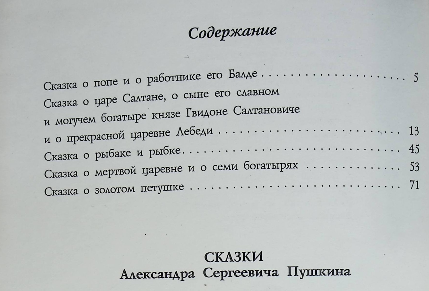 Сказка о царе Салтане, о сыне его славном и могучем богатыре князе Гвидоне Салтановиче и о прекрасной царевне Лебеди. Сказка о рыбаке и рыбке. Сказка о попе и о работнике его Балде. Сказка о мертвой царевне и о семи богатырях. Сказка о золотом петушке.