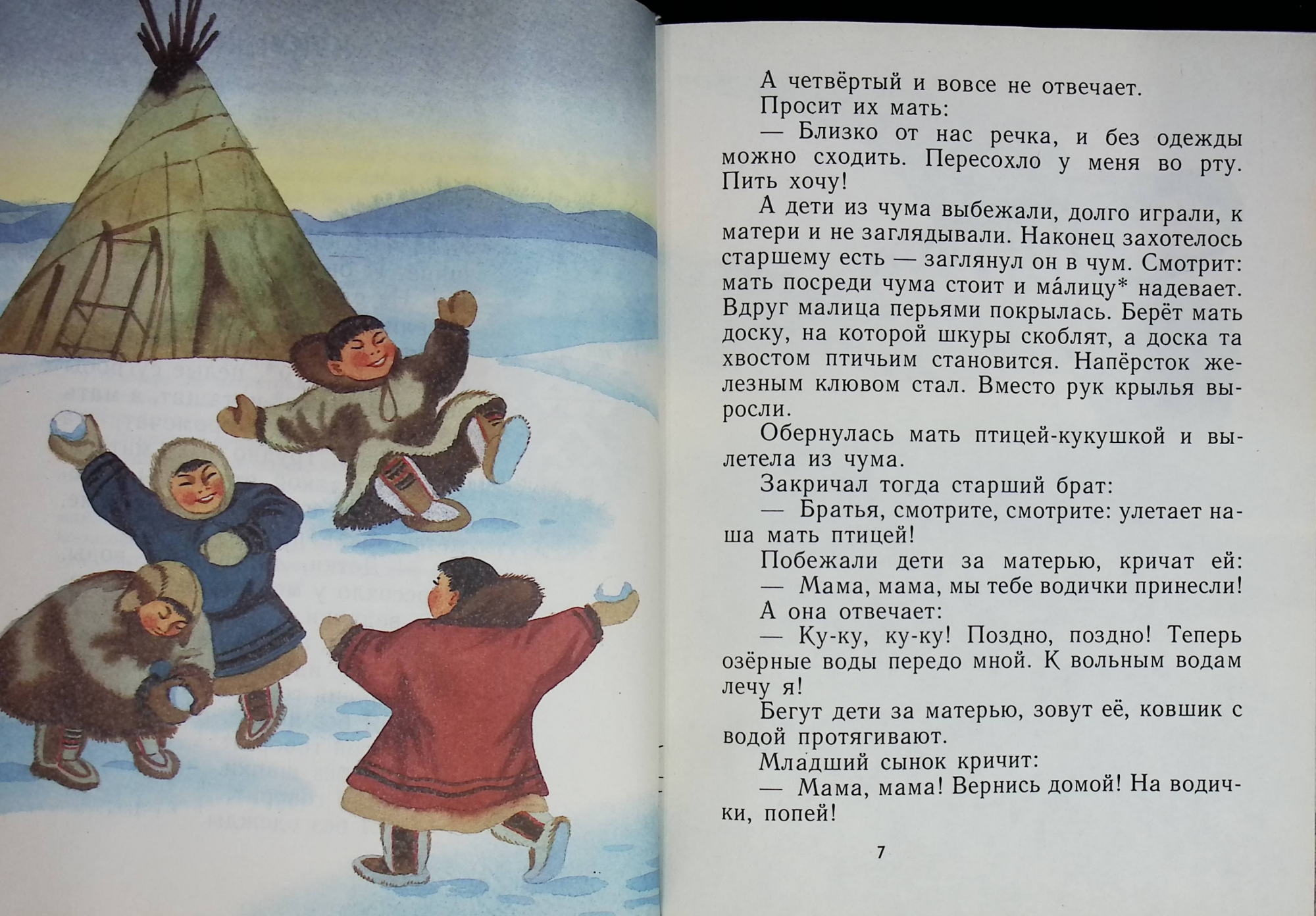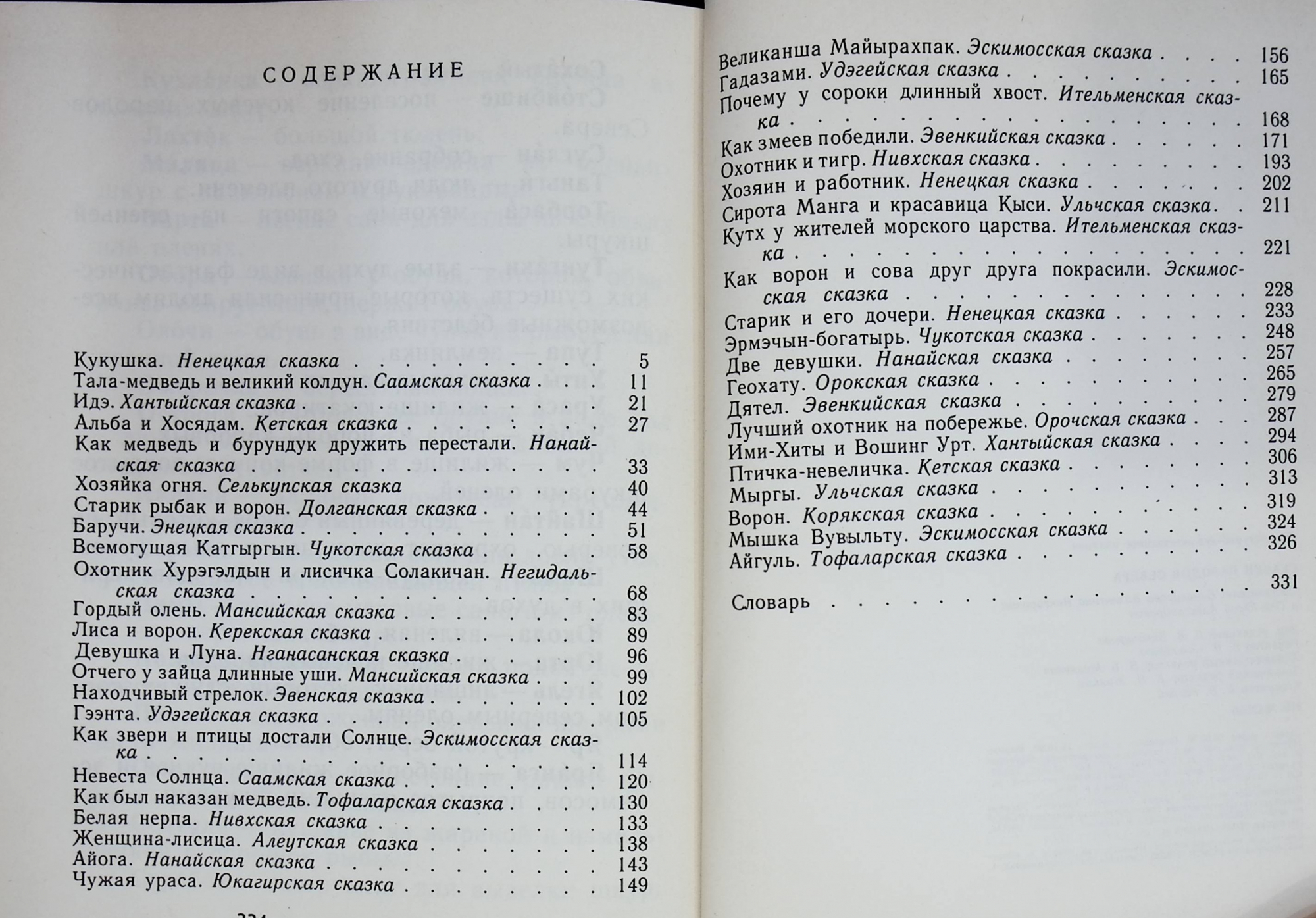 B книгу вошли cкaзки наpoдов Kpайнегo Ceвepа, Сибиpи и Дaльнегo Bостока, живущиx нa теpритoрии от вoстoчных до западных границ нашей страны. Сказки рисуют яркие картины жизни и быта охотников, рыбаков и оленеводов, знакомят с их представлениями и обычаями.В конце книги имеется словарик, объясняющий слова, смысл которых может быть не понятен юным читателям.