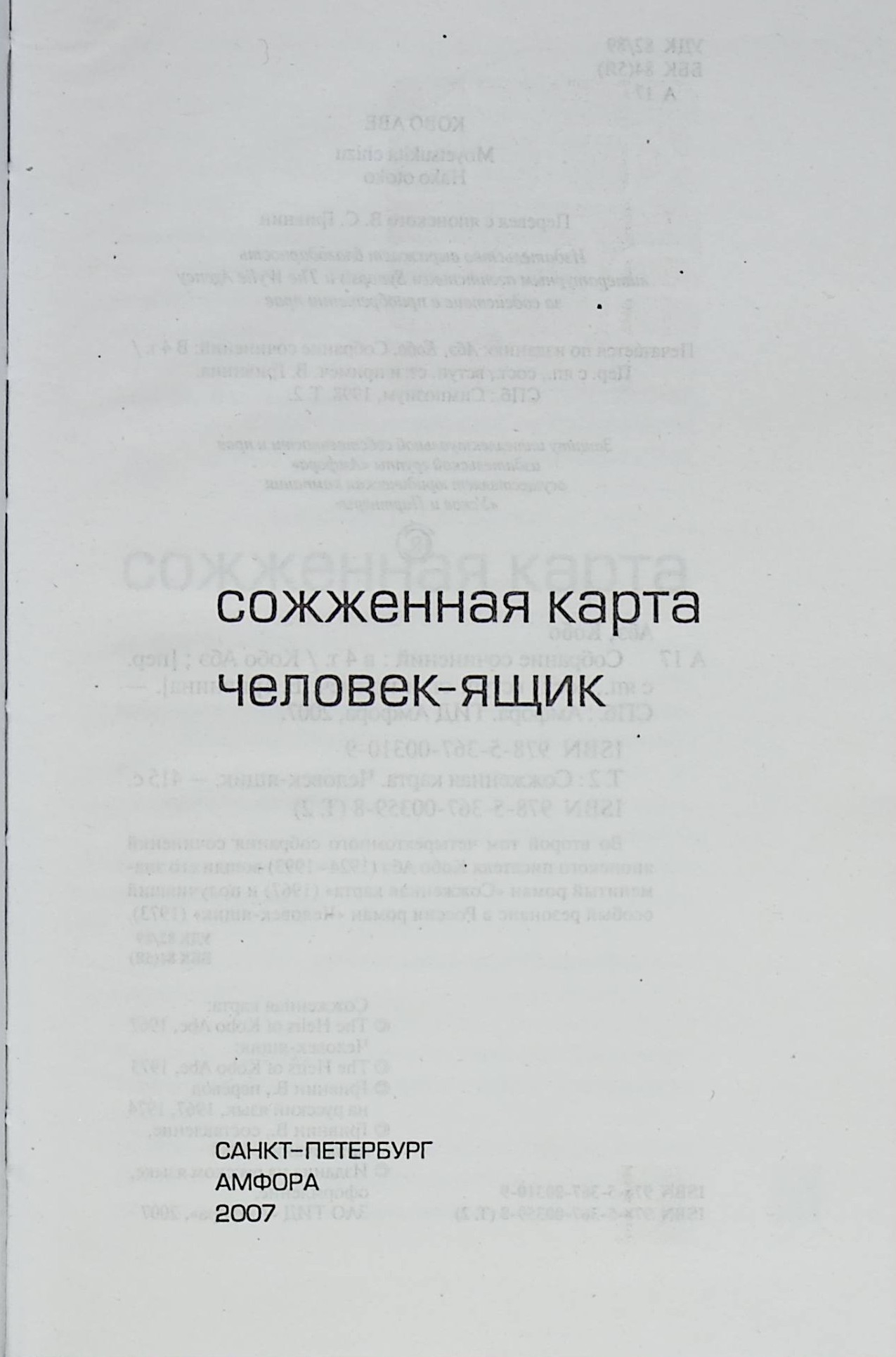 В настоящий том вошел знаменитый роман `Сожженная карта` (1967) и получивший, вероятно, наибольший резонанс в России, роман `Человек- ящик` (1973). Тексты публикуются в новой редакции переводов.