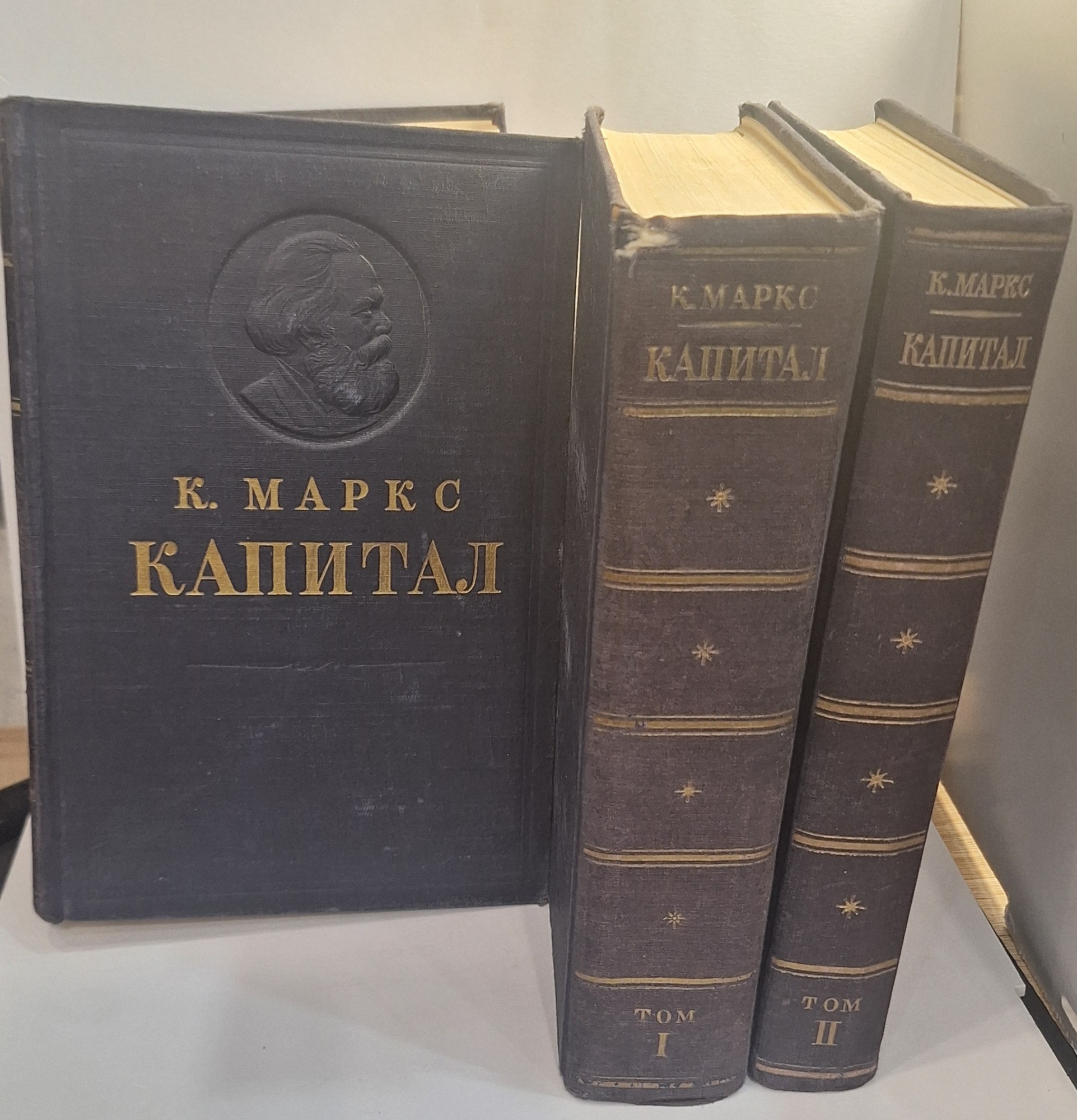 Полный комплект трех томов (третий том в двух книгах) в современных библиофильских переплетах (четвертый том был впервые издан позднее, после смерти Маркса и Энгельса). Тома помещаются в едином специально изготовленном предохранительном футляре. Тома в полной комплектности, без штампов. ОПИСЬ ТОМОВ. 1) Том первый. Книга первая: Процесс производства капитала. Издание, подготовленное К. Каутским. Перевод под редакцией В. Базарова и И. Степанова, пересмотренный И. Степановым. Издание пятое. М.-Л.: Государственное издательство, 1-я Образцовая типография, 1930. XLVI, [2], 621, [3] с. — 2) Том второй. Книга вторая: Процесс обращения капитала. Издание, подготовленное Ф. Энгельсом. Перевод под редакцией В. Базарова и И. Степанова. Печатается с первого издания, пересмотренного И. Степановым. Издание пятое. М.-Л.: Государственное издательство, 1-я Образцовая типография, 1930. XXI, [2], 384 с. — 3) Том третий. Книга третья: Процесс капиталистического производства, взятый в целом. [Часть первая]. Издание, подготовленное Ф. Энгельсом. Перевод под редакцией В. Базарова и И. Степанова, пересмотренный И. Степановым. Издание третье. М.-Л.: Государственное издательство, 1-я Образцовая типография, 1927. XXIV, 359 с. — 4) Том третий. Книга третья: Процесс капиталистического производства, взятый в целом. [Часть вторая]. Издание, подготовленное Ф. Энгельсом. Перевод под редакцией В. Базарова и И. Степанова, пересмотренный И. Степановым. Издание третье. М.-Л.: Государственное издательство, 1-я Образцовая типография, 1928. IV, 344 с. / / / «Капитал: Критика политической экономии» — главный труд немецкого философа и экономиста Карла Маркса по политической экономии, содержащий критический анализ капитализма. Работа написана с применением диалектико-материалистического подхода, в том числе к историческим процессам. Первый том, «Процесс производства капитала», впервые был опубликован в 1867 году тиражом 1000 экземпляров и является расширенным и переработанным вариантом опубликованной в 1859 году работы «К критике политической экономии». Уже после смерти Маркса Фридрих Энгельс скомпоновал из готовых фрагментов и черновиков два следующих тома: «Процесс обращения капитала» (1885) и «Процесс капиталистического производства, взятый в целом» (1894), которые в первоначальном замысле должны были составить единый второй том из двух книг. Смерть помешала ему подготовить к печати рукопись заключительного тома (четвертого в нынешней нумерации, третьего в нумерации Маркса), «Теорий прибавочной стоимости», из второго чернового варианта «Капитала», и этот том был впервые опубликован в 1905 — 1910 годах Карлом Каутским (он же внес в четвертый том значительные правки). Представленный перевод Ивана Скворцова-Степанова и Владимира Базарова считал лучшим В.И. Ленин. Институт марксизма-ленинизма считал этот перевод «в целом удовлетворительным». Этот вариант перевода вытеснил все прочие — дважды включался в полное собрание сочинений и переиздавался отдельными книгами до 1988 года.