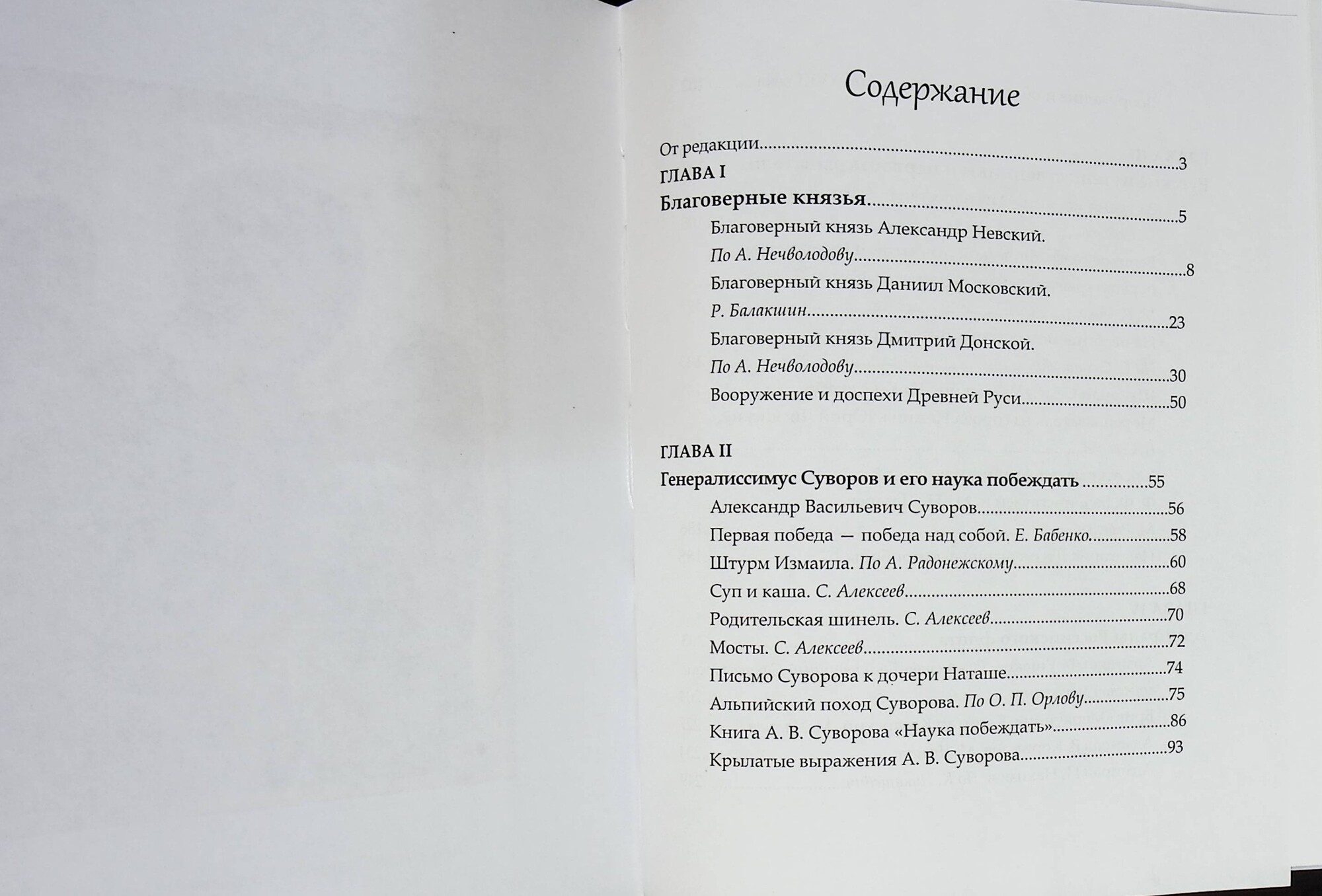 Книга рассказывает об удивительных людях — благоверных князьях св. Александре Невском, св. Дмитрии Донском, легендарных адмиралах — св. праведном воине Феодоре Ушакове, П. Нахимове и В. Корнилове, — о великом полководце А. Суворове, русских первооткрывателях А. Никитине, С. Дежнёве, С. Челюскине, М. Лазареве, о знаменитом хирурге Н. Пирогове, о простых солдатах, верой и правдой служивших Богу и своему народу. Герои рассказов мужественно сражаются с врагом, их не пугают опасности и лишения, потому что они сильны духом. Эта книга — о мужестве как уповании на Бога. В ней вы найдёте истории о верности долгу, о самоотверженности, благородстве — тех качествах, которые мы хотели бы видеть в наших детях.