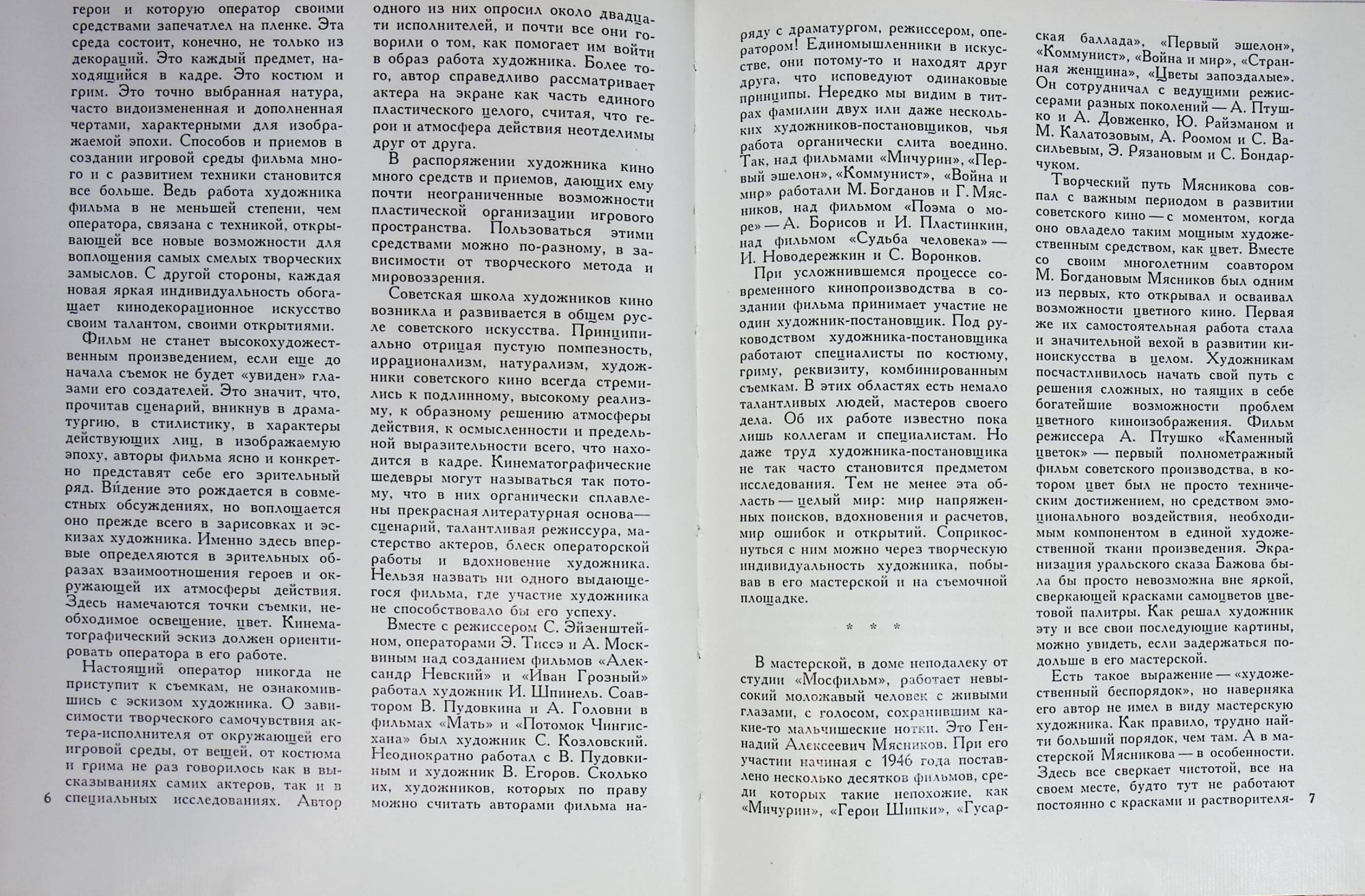 Монография Т. Тарасовой-Красиной "Геннадий Мясников" посвящена творчеству видного художника кино. Созданные при его участии фильмы "Мичурин", "Первый эшелон", "Коммунист", "Хождение за три моря" отличаются своеобразным и ярким выразительным решением.Высоких профессиональных качеств потребовала от художника работа над фильмом "Война и мир",выдвинувшая его в число лучших мастеров среди художников-постановщиков. Монография раскрывает специфику работы художника кино,рисует живой образ одного из интереснейших представителей этой профессии. Издание рассчитано на широкий круг читателей.