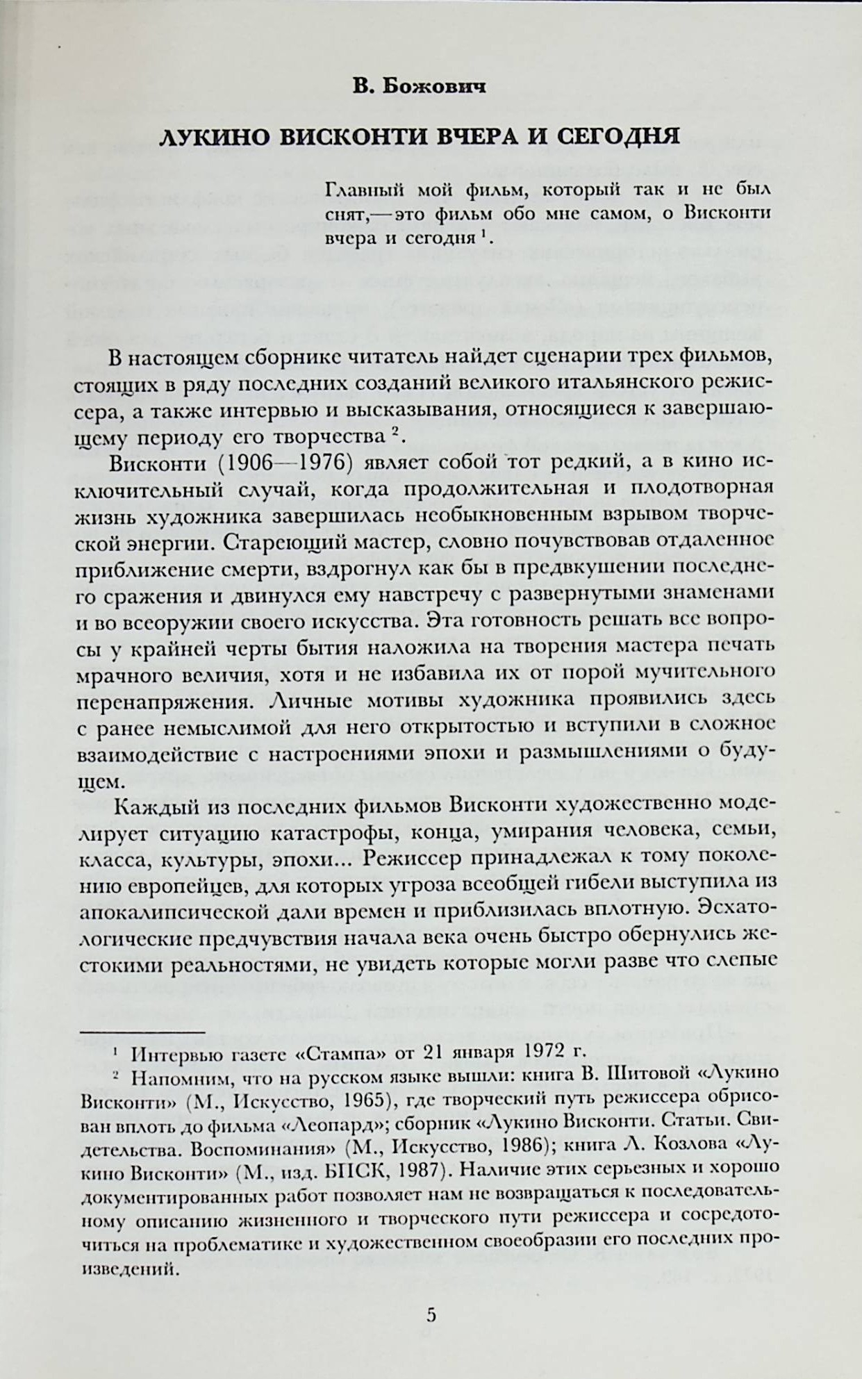 В сборник вошли сценарии его фильмов "Гибель богов", "Людвиг" (о короле-меценате Людвиге II Баварском), "Семейный портрет в интерьере", а также интервью и статьи Висконти о его работе в театре и кино.