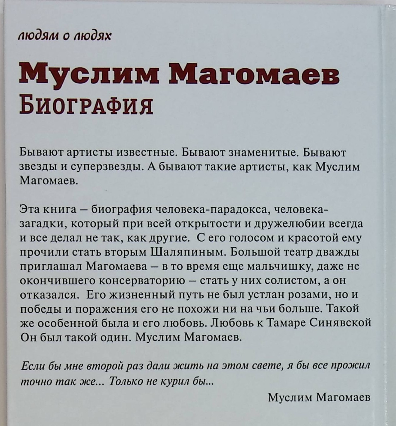 Бывают артисты известные. Бывают знаменитые. Бывают звезды и суперзвезды. А бывают такие артисты, как Муслим Магомаев. Эта книга - биография человека-парадокса, человека-загадки, который при всей открытости и дружелюбии всегда и все делал не так, как другие. С его голосом и красотой ему прочили стать вторым Шаляпиным. Большой театр дважды приглашал Магомаева - в то время еще мальчишку, даже не окончившего консерваторию - стать у них солистом, а он отка-зался. Его жизненный путь не был устлан розами, но и победы и поражения его не похожи ни на чьи больше. Такой же особенной была и его любовь. Любовь к Тамаре Синявской. Он был такой один. Муслим Магомаев.