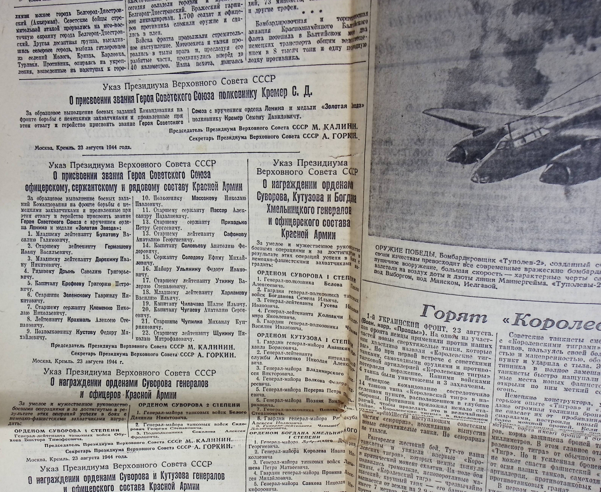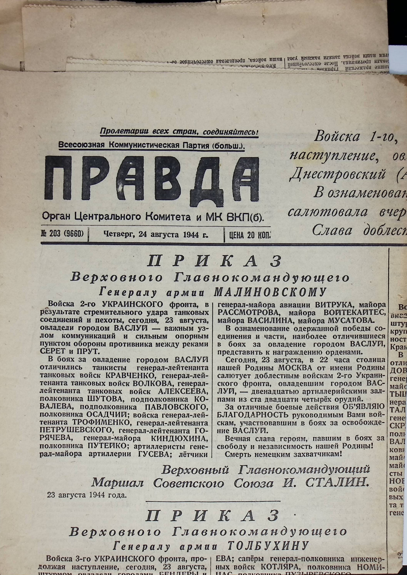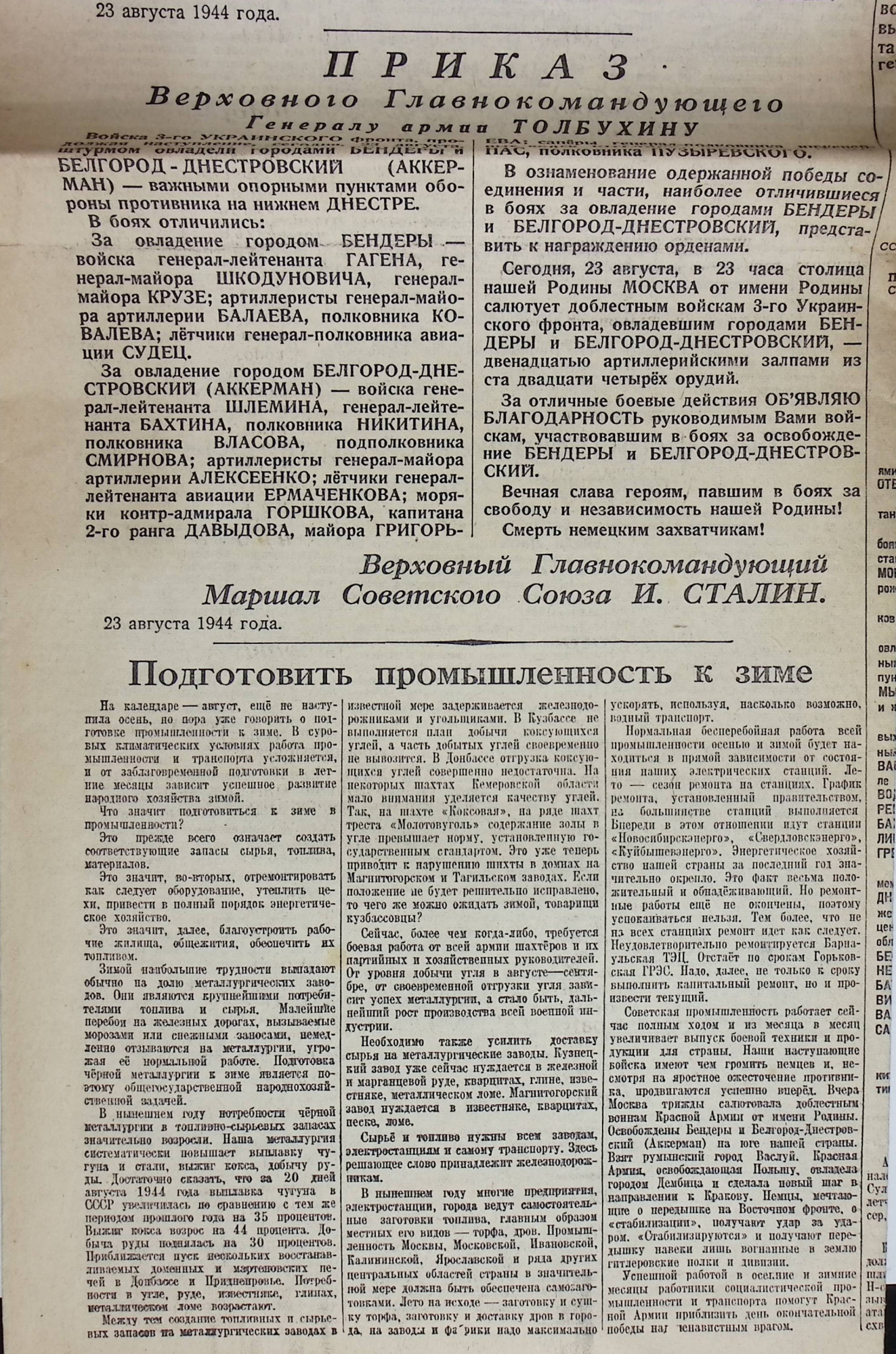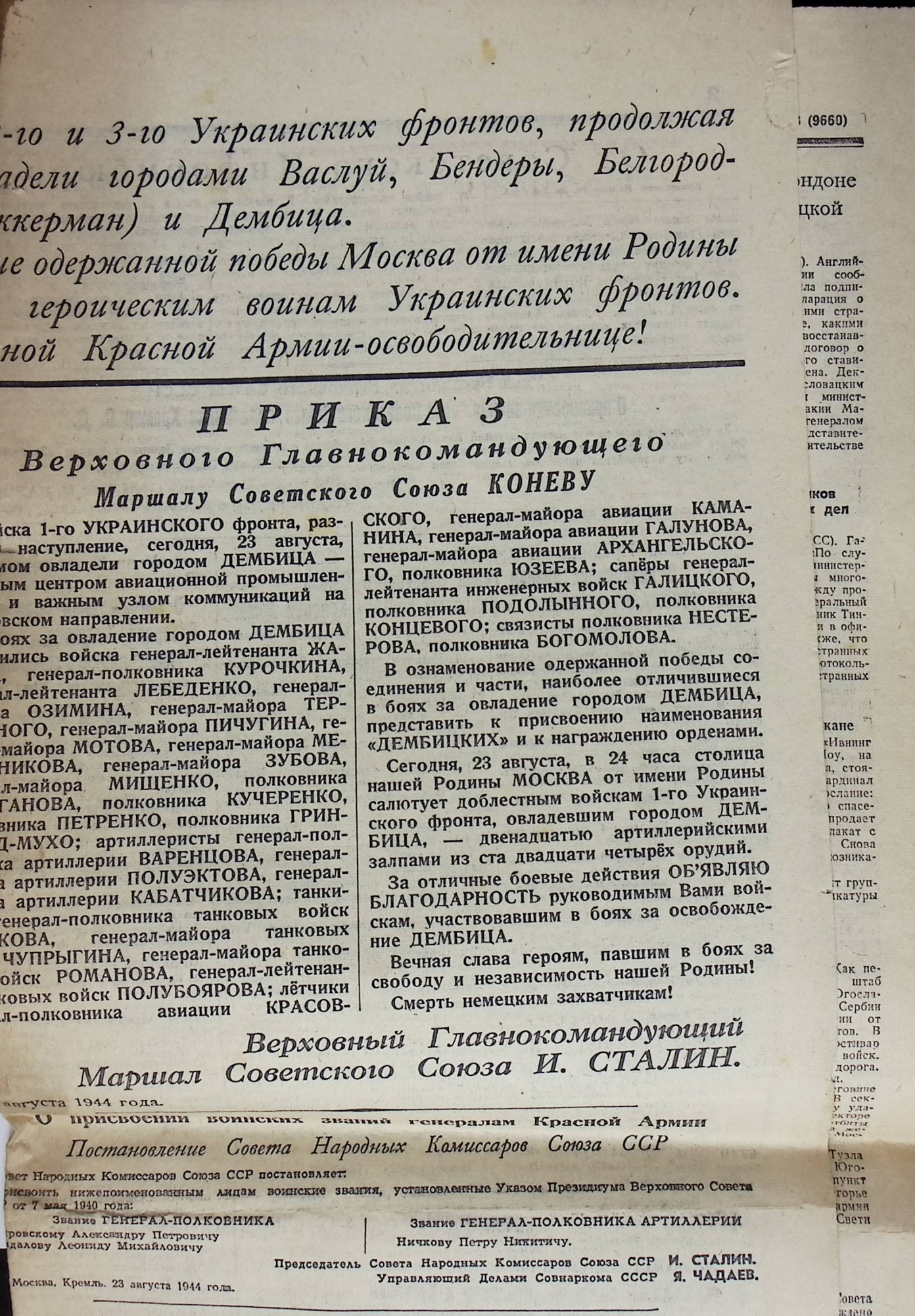 Статьи: От Советского Информбюро. Приказы Сталина Малиновскому. Указ о награждении орденами Суворова, Кутузова...