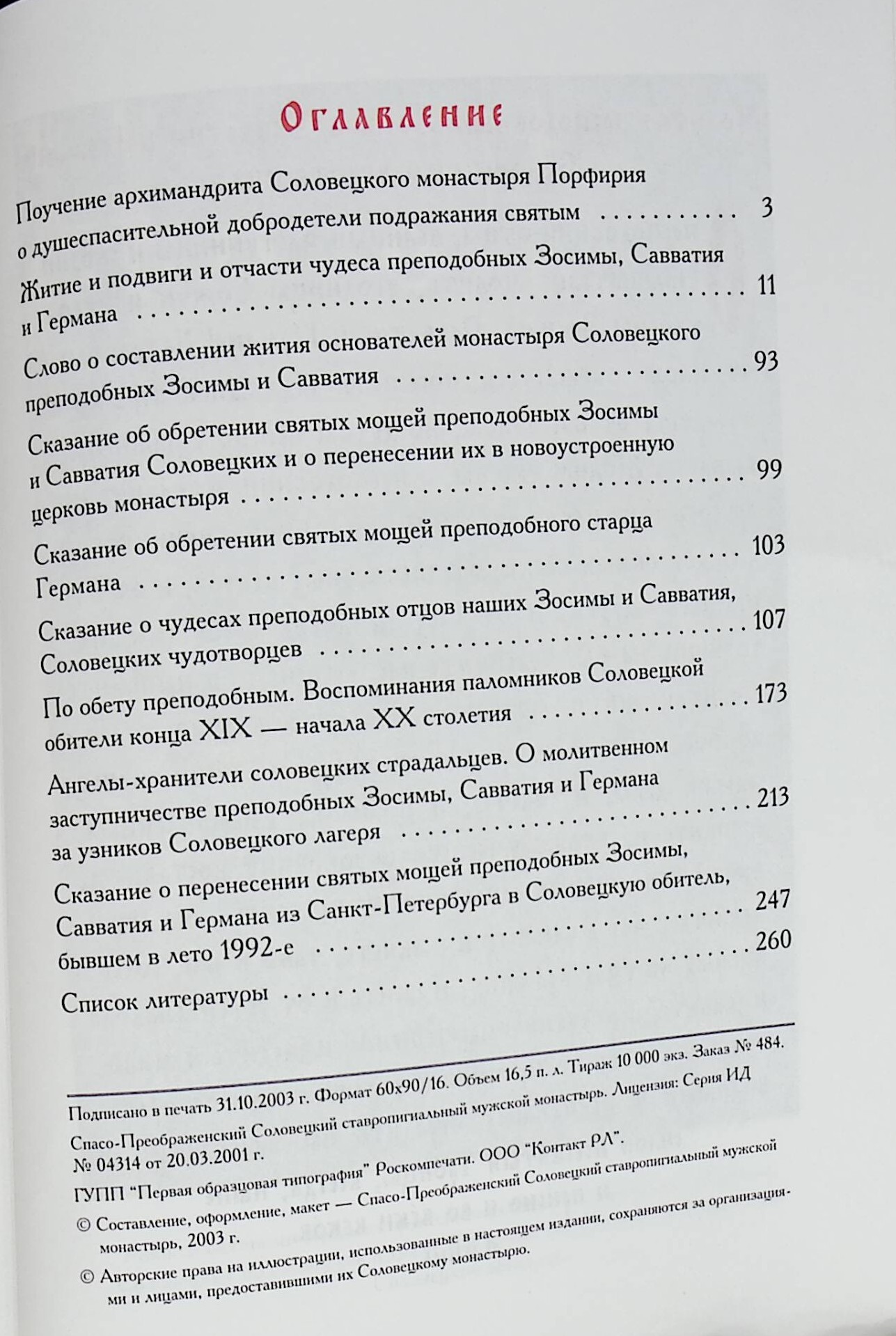 К 500-летию составления первой редакции жизнеописания преподобных Соловецких первоначальников. Сборник содержит Житие и подвиги и отчасти чудеса преподобных Зосимы, Савватия и Германа.