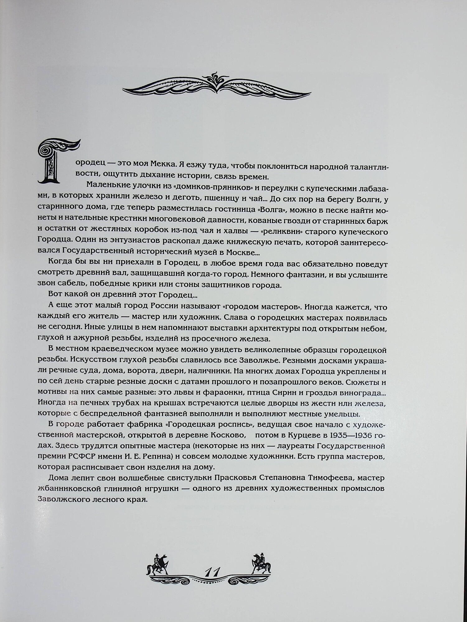 Знаменитая Городецкая роспись занимает одно из почетных мест в ряду самых известных народных художественных промыслов России: палеха, хохломы, мстеры, жостово... Название росписи происходит от древнего русского города Городца (ровесника Москвы), что находится на берегу великой русской реки Волги. Родившись в окрестных деревнях как подсобный промысел нижегородских крестьян, сегодня он процветает в самом Городце, в этом маленьком старинном городе, где творит целое созвездие народных мастеров росписи и резьбы по дереву, вышивки и глиняной игрушки, изделий из железа и гончарного искусства. В настоящем издании рассказывается о двух ведущих фабриках русских традиционных художественных промыслов – акционерных обществах "Городецкая роспись" и "Татьяна". Творчество современных мастеров этих промыслов концентрирует в себе давно сложившиеся традиции каждого промысла, целый комплекс специфических выразительных средств, основные мотивы народного искусства этого региона России и свою неповторимую образную систему.