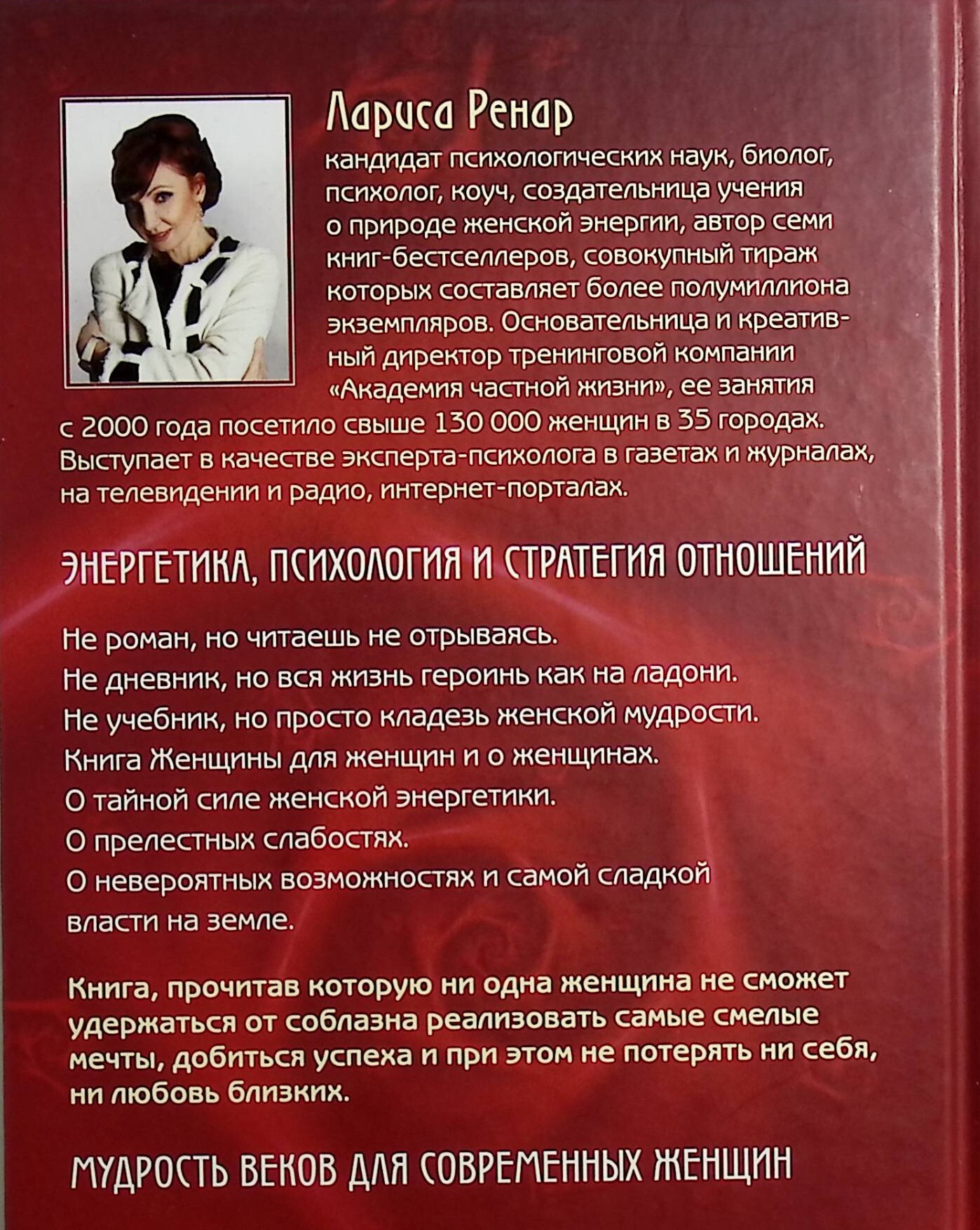 Энергетика, психология и стратегия отношений в бестселлере Ларисы Ренар — проверенное временем и многочисленными переизданиями пособие к законам мужского и женского для миллионов читателей. Учебник тактики состояний, поведения и образов истинной женщины, знающей, чего она хочет и как этого достичь.