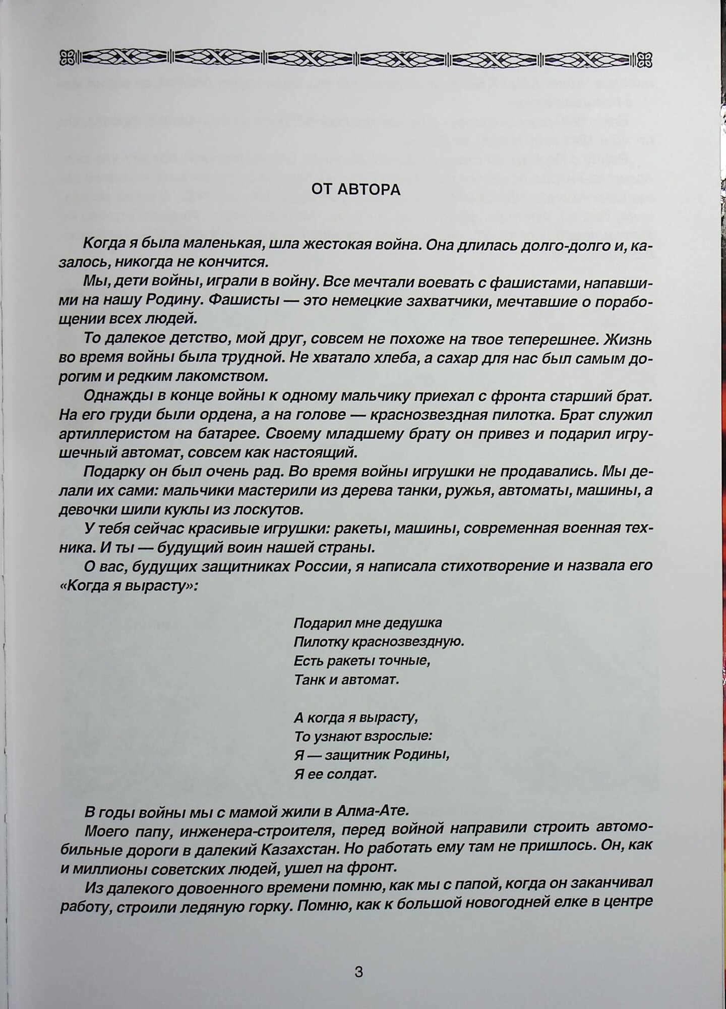 Это книга о героических подвигах детей в годы Великой Отечественной войны, о самых смелых и бескорыстных подвигах. Суровые испытания военного лихолетья выпали не только взрослым, но и детям. Вчерашние школьники взяли оружие и вступили в смертный бой с фашистами. Автором использована богатая литература о подвиге нашего народа в годы тяжелых испытаний. Рассказывается в книге и о событиях последнего десятилетия двадцатого века в Афганистане, Таджикистане, на Кавказе. В частности, о войне в Чечне, в которой участвовали и дети. Книга призывает к справедливости, честности, защите Родины. Воспитывает чувство патриотизма у молодого поколения россиян. Книга включена в Федеральную программу РФ поддержки книгоиздания на 2003 год. Издание рекомендовано Комитетом образования при Правительстве Москвы для комплектования школьных библиотек. Книга включена в план издательской деятельности Постоянного комитета Союзного государства Беларуси и России.