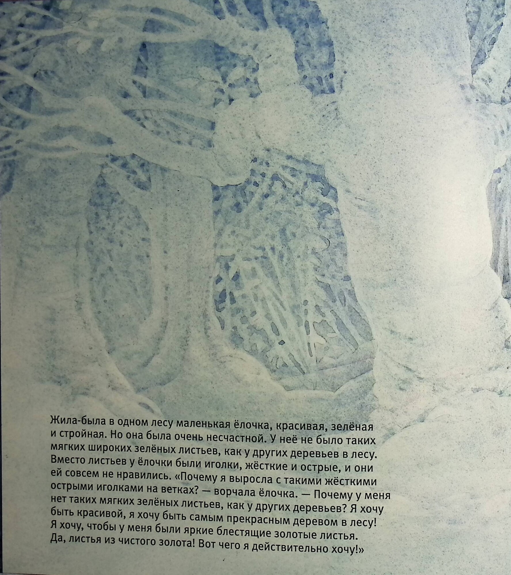 Маленькая ёлочка очень хотела стать самым красивым деревом в лесу и ради этого поменяла свои колючие иголки на листья. Но даже золотые и хрустальные листья не сделали ёлочку счастливой; потеряв их, она поняла, что только став самим собой, можно обрести подлинную красоту, которую обязательно оценят окружающие.