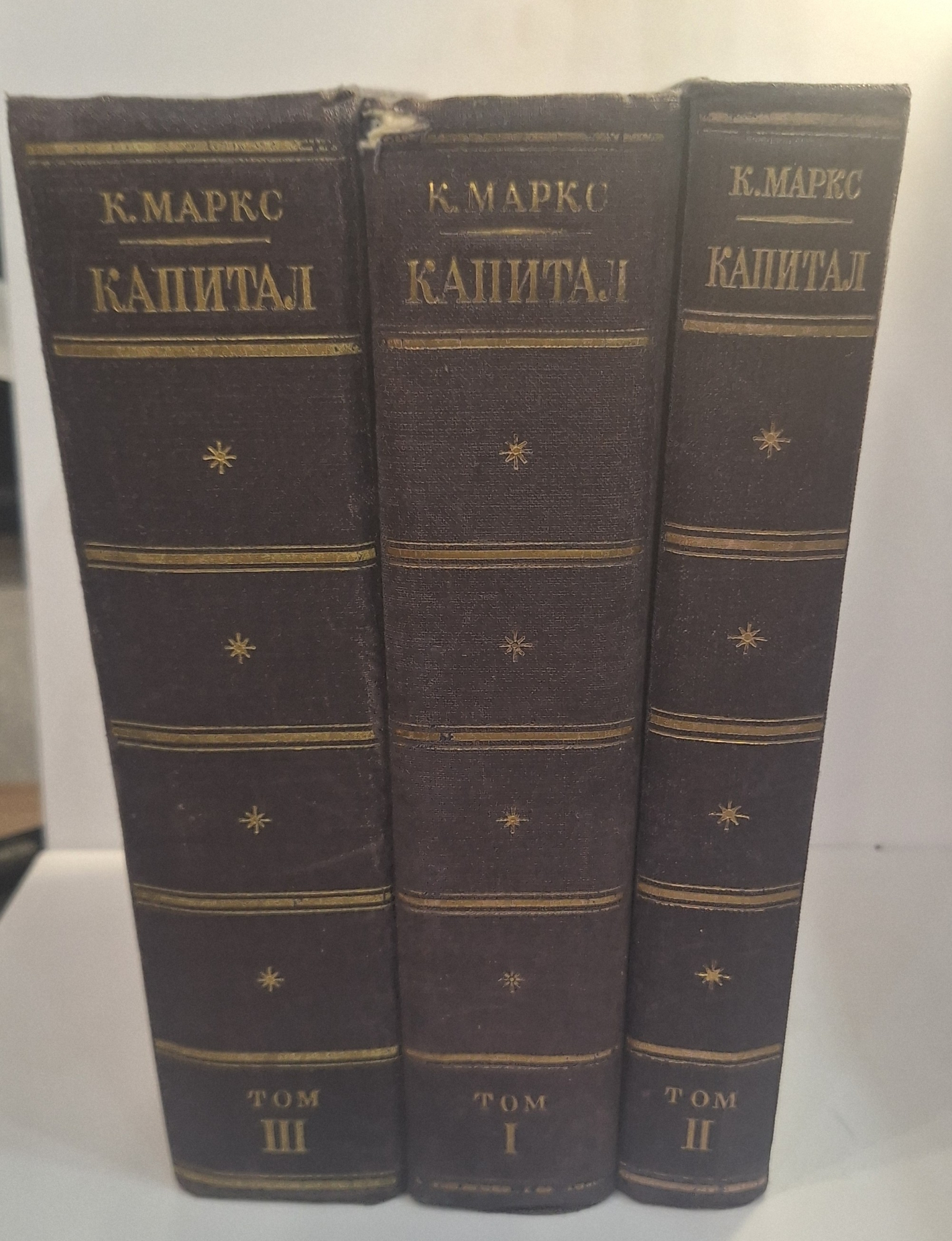 Полный комплект трех томов (третий том в двух книгах) в современных библиофильских переплетах (четвертый том был впервые издан позднее, после смерти Маркса и Энгельса). Тома помещаются в едином специально изготовленном предохранительном футляре. Тома в полной комплектности, без штампов. ОПИСЬ ТОМОВ. 1) Том первый. Книга первая: Процесс производства капитала. Издание, подготовленное К. Каутским. Перевод под редакцией В. Базарова и И. Степанова, пересмотренный И. Степановым. Издание пятое. М.-Л.: Государственное издательство, 1-я Образцовая типография, 1930. XLVI, [2], 621, [3] с. — 2) Том второй. Книга вторая: Процесс обращения капитала. Издание, подготовленное Ф. Энгельсом. Перевод под редакцией В. Базарова и И. Степанова. Печатается с первого издания, пересмотренного И. Степановым. Издание пятое. М.-Л.: Государственное издательство, 1-я Образцовая типография, 1930. XXI, [2], 384 с. — 3) Том третий. Книга третья: Процесс капиталистического производства, взятый в целом. [Часть первая]. Издание, подготовленное Ф. Энгельсом. Перевод под редакцией В. Базарова и И. Степанова, пересмотренный И. Степановым. Издание третье. М.-Л.: Государственное издательство, 1-я Образцовая типография, 1927. XXIV, 359 с. — 4) Том третий. Книга третья: Процесс капиталистического производства, взятый в целом. [Часть вторая]. Издание, подготовленное Ф. Энгельсом. Перевод под редакцией В. Базарова и И. Степанова, пересмотренный И. Степановым. Издание третье. М.-Л.: Государственное издательство, 1-я Образцовая типография, 1928. IV, 344 с. / / / «Капитал: Критика политической экономии» — главный труд немецкого философа и экономиста Карла Маркса по политической экономии, содержащий критический анализ капитализма. Работа написана с применением диалектико-материалистического подхода, в том числе к историческим процессам. Первый том, «Процесс производства капитала», впервые был опубликован в 1867 году тиражом 1000 экземпляров и является расширенным и переработанным вариантом опубликованной в 1859 году работы «К критике политической экономии». Уже после смерти Маркса Фридрих Энгельс скомпоновал из готовых фрагментов и черновиков два следующих тома: «Процесс обращения капитала» (1885) и «Процесс капиталистического производства, взятый в целом» (1894), которые в первоначальном замысле должны были составить единый второй том из двух книг. Смерть помешала ему подготовить к печати рукопись заключительного тома (четвертого в нынешней нумерации, третьего в нумерации Маркса), «Теорий прибавочной стоимости», из второго чернового варианта «Капитала», и этот том был впервые опубликован в 1905 — 1910 годах Карлом Каутским (он же внес в четвертый том значительные правки). Представленный перевод Ивана Скворцова-Степанова и Владимира Базарова считал лучшим В.И. Ленин. Институт марксизма-ленинизма считал этот перевод «в целом удовлетворительным». Этот вариант перевода вытеснил все прочие — дважды включался в полное собрание сочинений и переиздавался отдельными книгами до 1988 года.