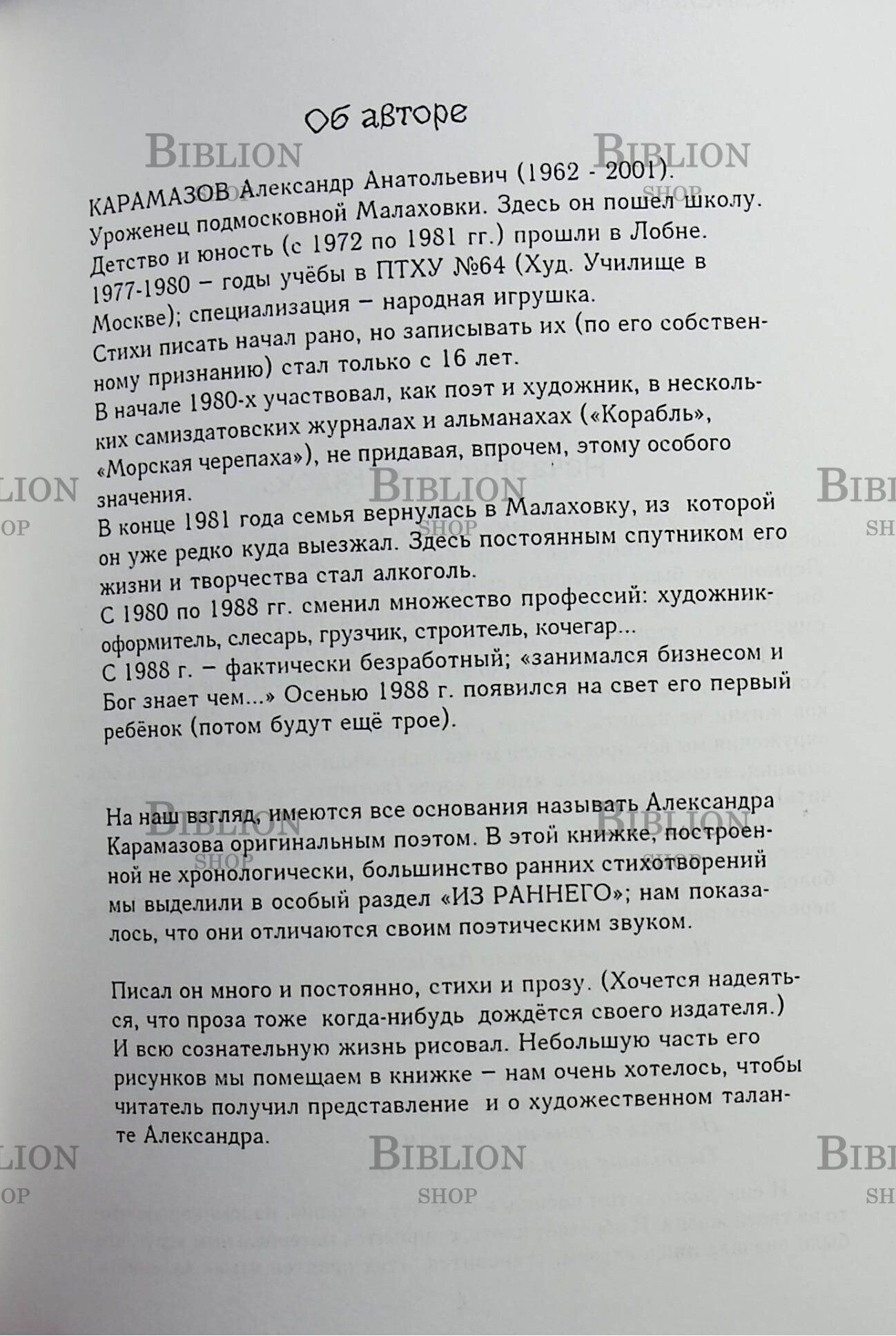 Поэт Александр Карамазов (1962–2001).В начале 80-х Карамазов как поэт и художник участвовал в самиздатовских журналах и альманахах «Корабль», «Морская черепаха». Посмертно вышел сборник стихов «Неназначенные встречи», но публикаций мало: кроме изданий Малаховки, с которой связана основная часть жизни поэта, и сборника поэтов Люберецкого района Подмосковья «У родника», – в составленной Иваном Ахметьевым, Германом Лукомниковым, Владимиром Орловым и Андреем Урицким антологии «Русские стихи. 1950–2000».