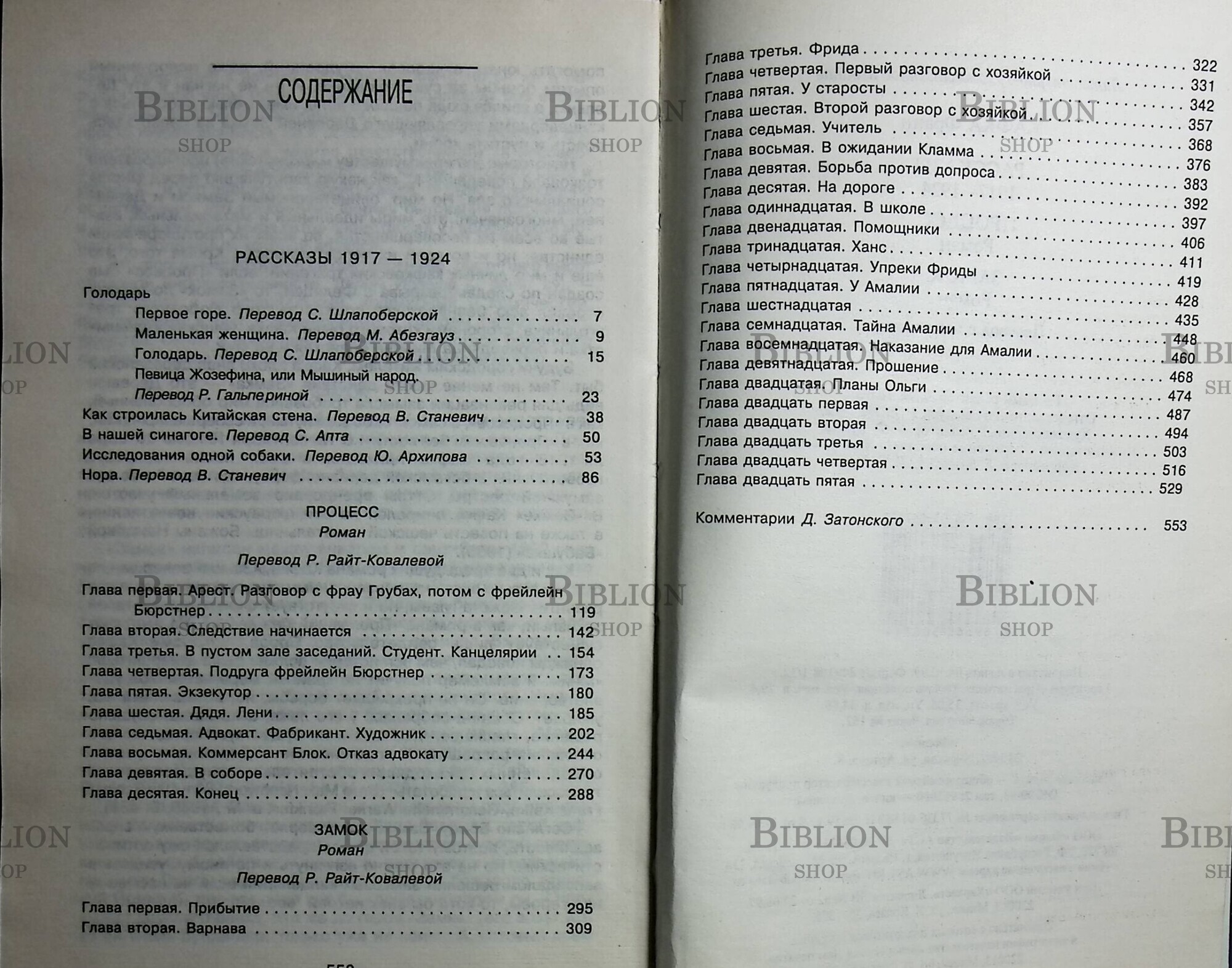 В книгу вошли романы "Процесс" и "Замок", изданные уже после смерти автора, а также четыре истории, составляющие сборник "Голодарь", и рассказы - фрагменты из наследия, увидевшие свет в 1931-1937 гг. , благодаря стараниям друга Кафки Макса Брода.