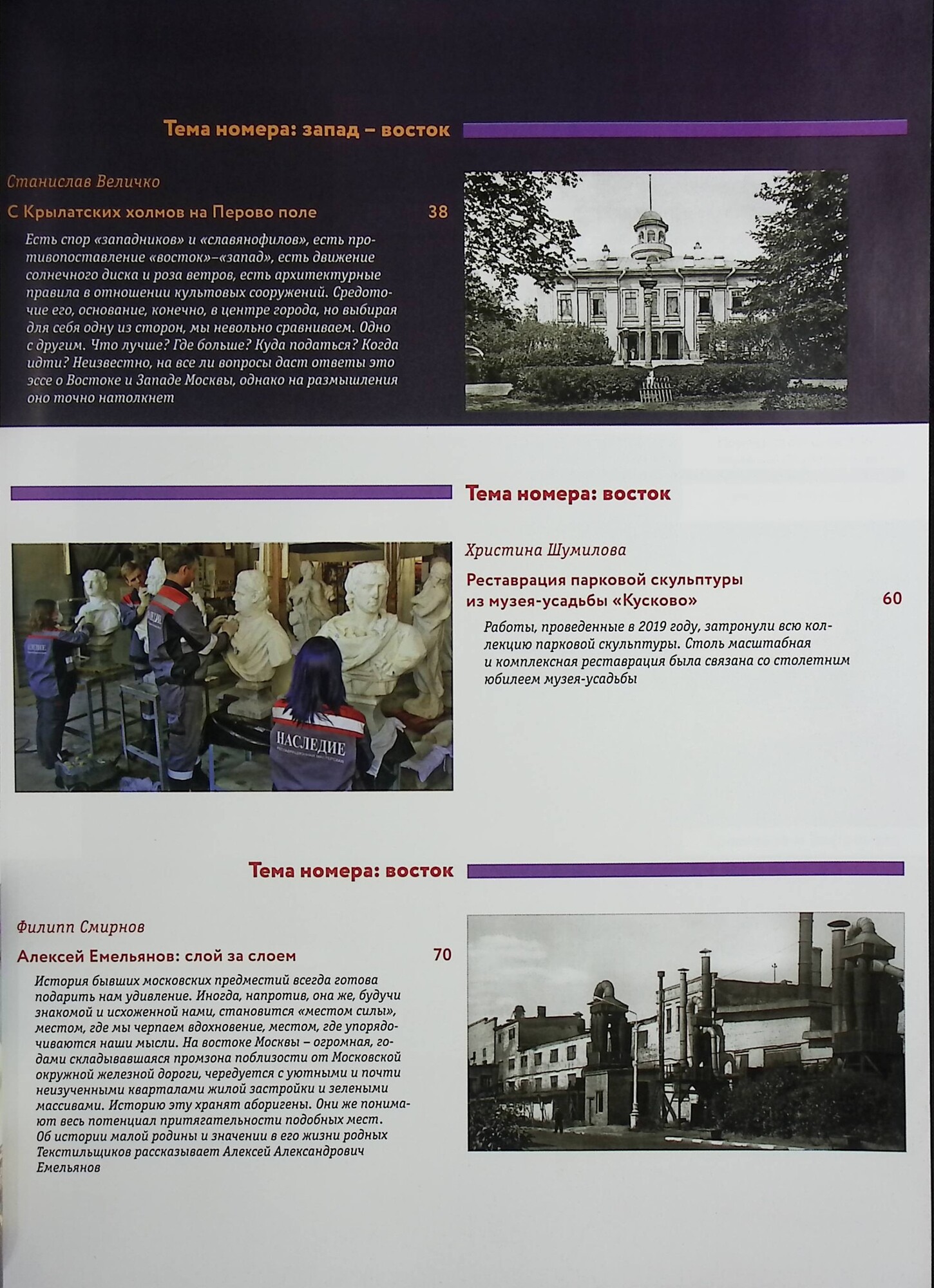 Материал о парковой скульптуры из музея-усадьбы "Кусково", усадьбах на востоке и западе Москвы и прочих выдающихся исторических объектов.Научно-популярный просветительский журнал, выпускаемый с 2006 года при поддержке Правительства Москвы, публикует материалы об истории и новостях архитектуры города, мнения горожан и экспертов о ситуации в сфере обеспечения сохранности объектов культурного наследия, опыте их реставрации и месте в столичных градостроительных планах, уникальные фотографии и современные репортажи, маршруты познавательных культурологических прогулок.