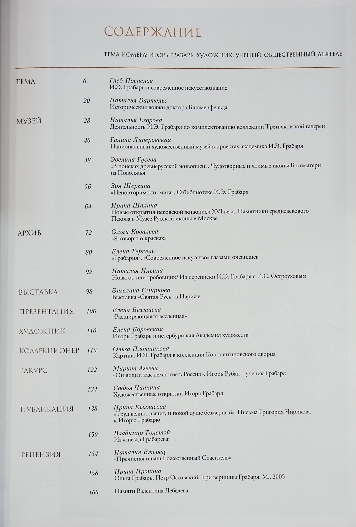 Номер, посвященный И.Э. Грабарю, в равной мере можно считать и юбилейным - в будущем году исполнится 140 лет со дня рождения Игоря Эммануиловича, и мемориальным - вот уже полвека как его не стало. Работа редакции над данным выпуском шла, однако, без привязки к какой-то конкретной дате: он третий (после «третьяковского» и «остроуховского»), логично завершающий ряд монографических номеров, инициированных издателями «Русского искусства» - Благотворительным Фондом имени П.М. Третьякова. В 1913 году И.Э. Грабарь сменяет И.С. Остроухова в должности попечителя Третьяковской галереи, а с 1918 по 1925 год является ее директором. И акцент в этом номере естественным образом ставится на деятельности Грабаря, связанной с жизнью галереи.