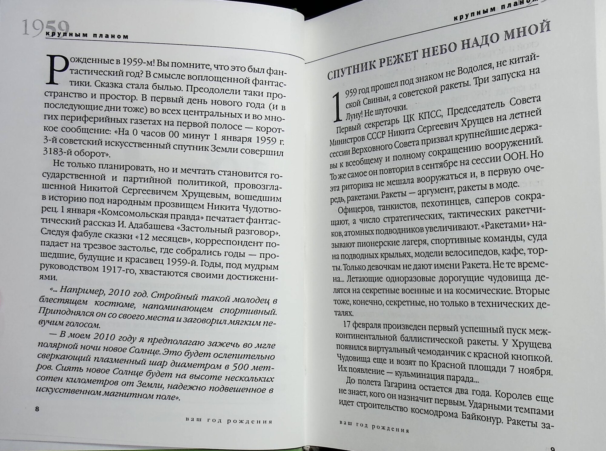 Что мы помним про 1959 год? Да ничего особенного. Но в действительности он был очень насыщенным: на Американской национальной выставке москвичи и гости столицы впервые отведали кока-колы и жвачки, на Первом московском международном кинофестивале они же полюбовались на скопление звезд, а весь советский народ - на снимки обратной стороны Луны. Хрущев вернулся из Америки с кукурузным початком, на пляжах появились первые мачо в эластичных плавках... Об этом и многом другом - в первой части книги. Вторая же написана специально для рожденных в год Желтого Кабана. В ней - их астрологический портрет и прогноз на ближайшие 12 лет.