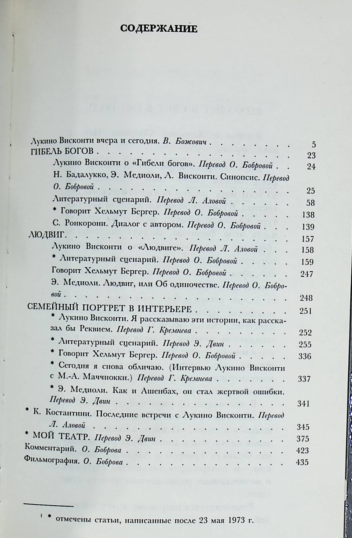 В сборник вошли сценарии его фильмов "Гибель богов", "Людвиг" (о короле-меценате Людвиге II Баварском), "Семейный портрет в интерьере", а также интервью и статьи Висконти о его работе в театре и кино.