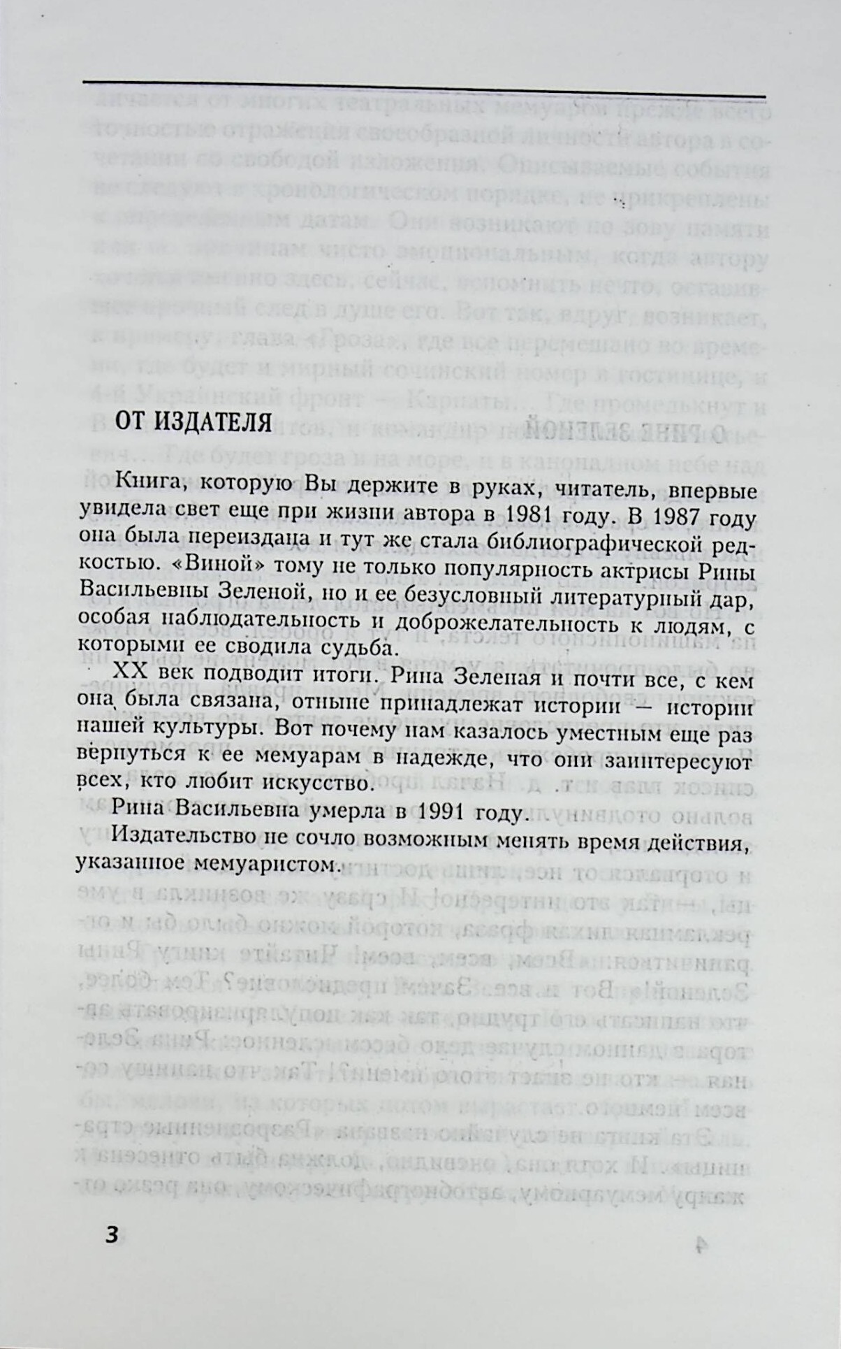 В своей книге воспоминаний известнейшая актриса Рина Зеленая ярко и талантливо воссоздает сложный и прекрасный мир мир искусства, в котором ей довелось жить и работать многие годы, собственно, всю жизнь. Рассказывая об этой жизни, актриса рисует широкий и одновременно остроиндивидуальный портрет целой эпохи.