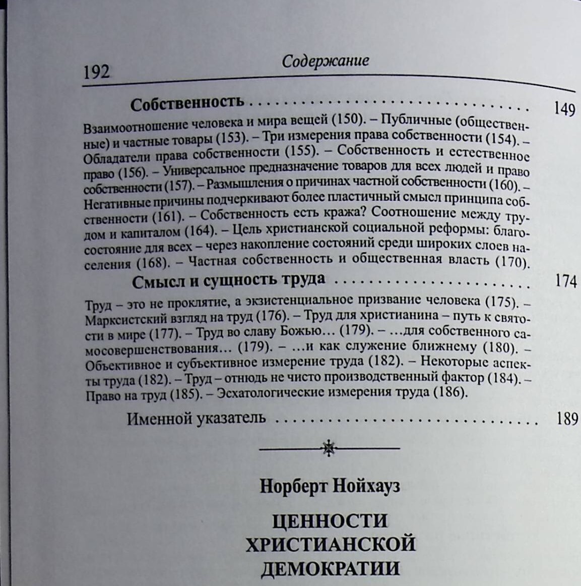 Руководитель фонда "Помощь Церкви в беде" д-р Норберт Нойхауз, исходя из представлений христианской антропологии о сущности человека, о смысле и задаче его жизни, излагает принципы и приоритеты политико-экономического устройства общества с точки зрения христианского социального учения. Основное внимание автор уделяет такому порядку "совместной жизни людей", который создает благоприятные условия для развития личности. В этой связи рассматриваются понятия субсидиарности и солидарности, свободы, общего блага, социальной рыночной экономики, взаимоотношения государства, гражданского общества и различного рода объединений (общин). Автор высказывает свою точку зрения на либеральное общество и на социализм.