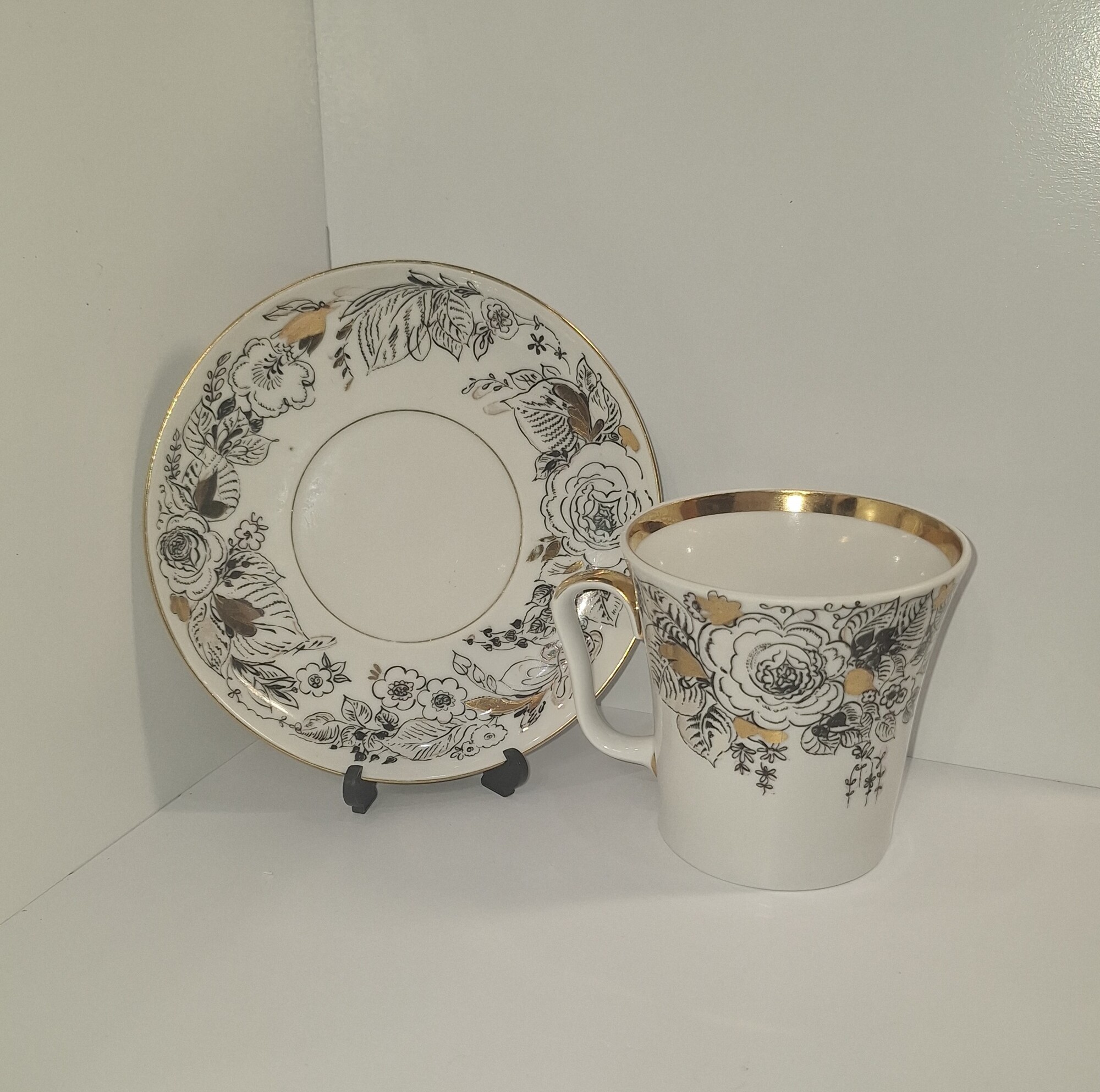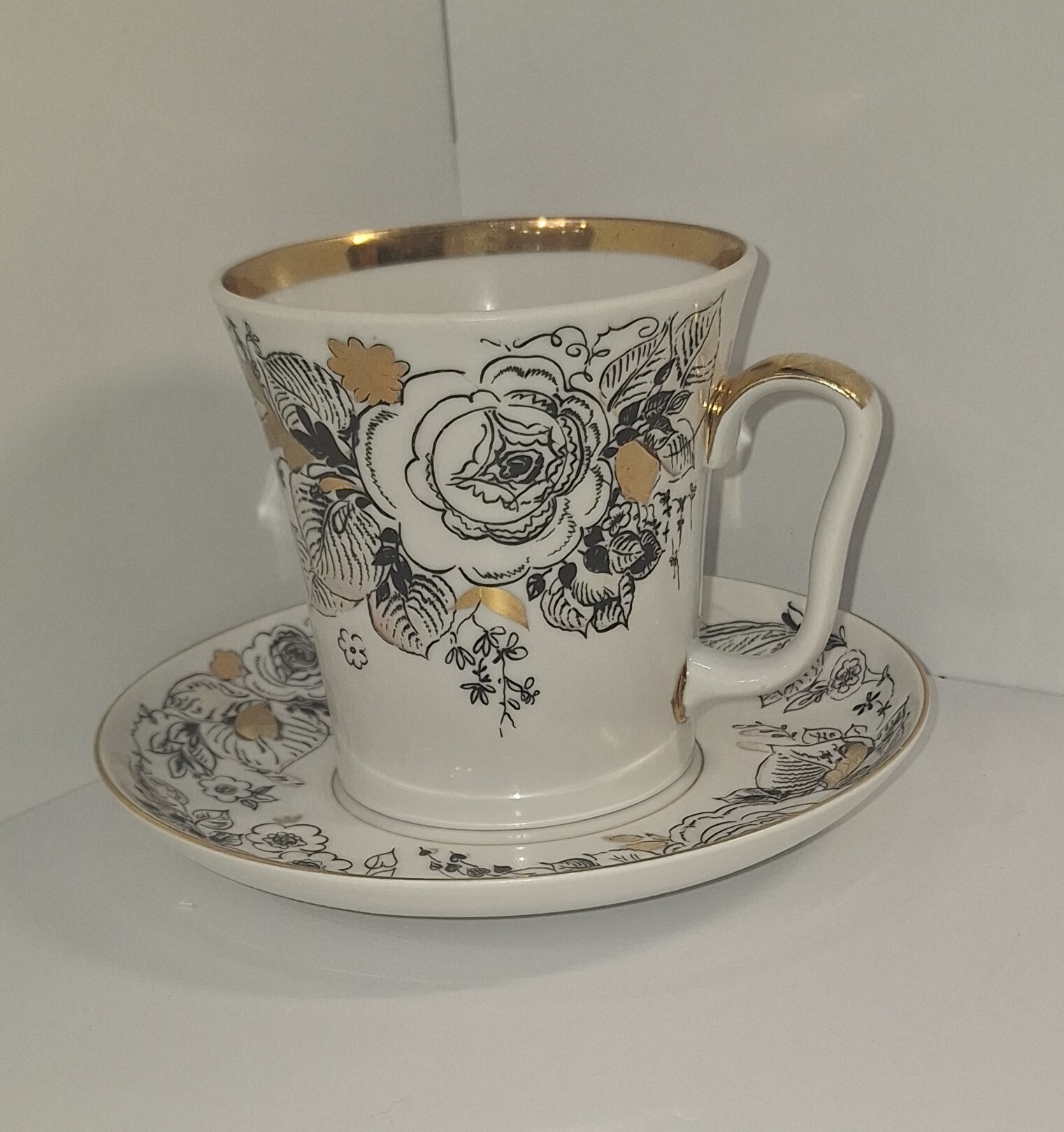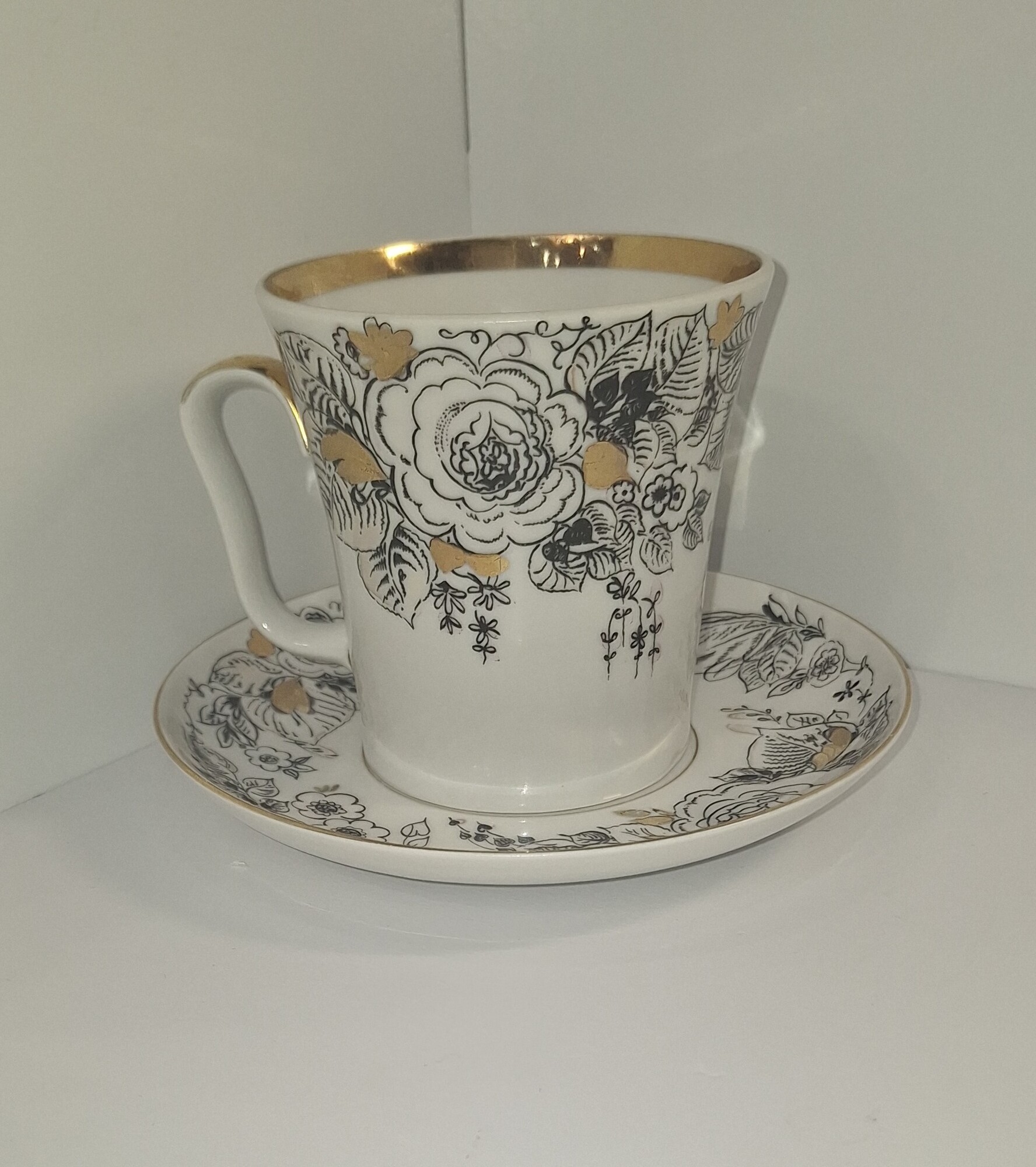 Винтажная чайная пара ЛФЗ "Розы", (форма "Ленинградский"), фарфор, деколь, золочение, Ленинградский фарфоровый завод (ЛФЗ), СССР 1970-е гг