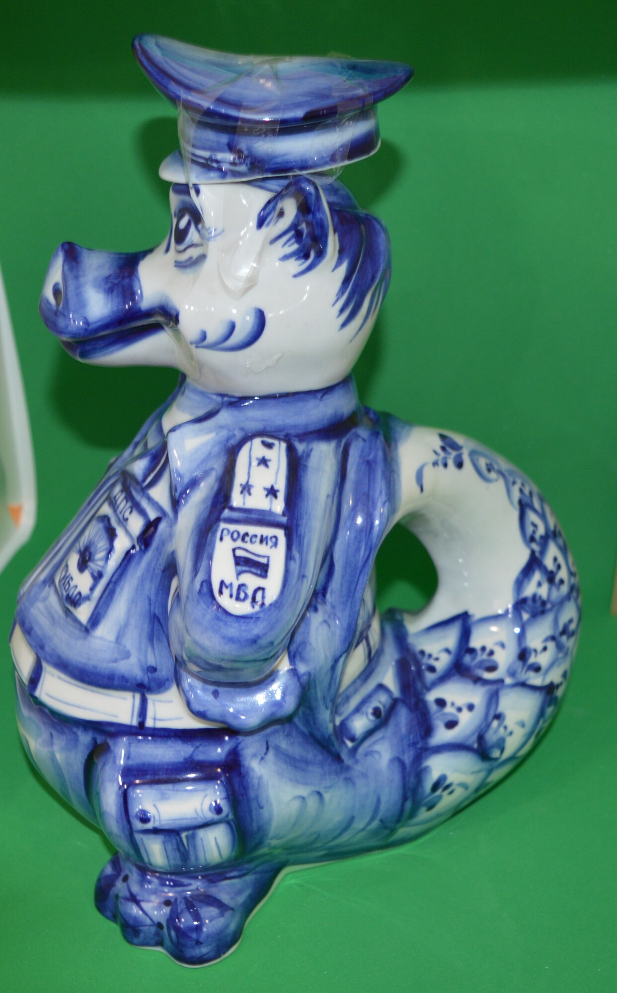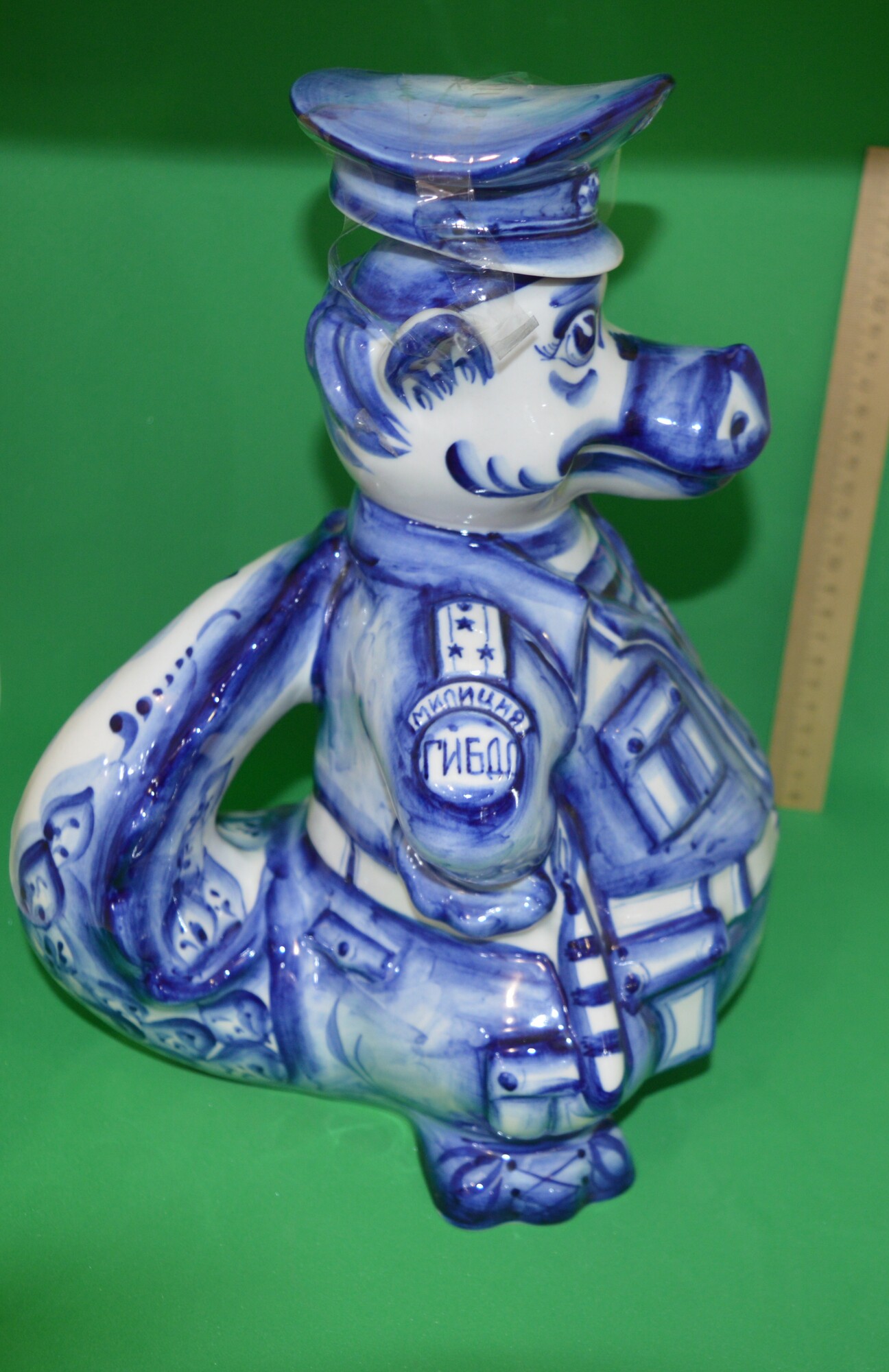 Главная Интернет-магазин Винтаж,старинные вещи, предметы интерьера Штоф "ГИБДД. Бегемот" (Гжель,фарфор, роспись, авторская работа Жмулиной Р. )