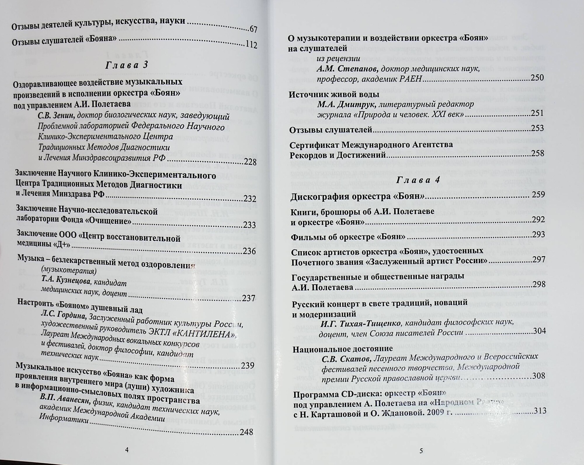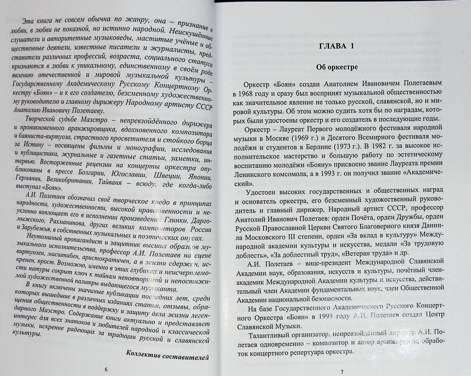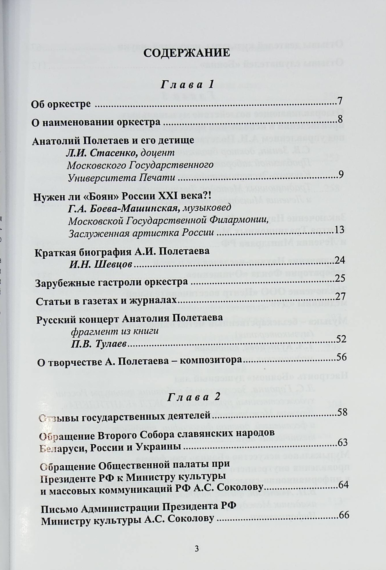 Книга подготовлена к 75-летию Народного артиста СССР Анатолия Полетаева, 55-летию его творческой деятельности и 45-летию созданного и возглавляемого им "Государственного Академического Русского Концертного Оркестра "Боян". Анатолий Полетаев-исполнитель-виртуоз,совершивший революцию в технике игры на баяне,дирижер,соединивший в оркестре народные и симфонические инструменты,аранжировщик,композитор-многие годы служит делу просвещения и развития русской музыкальной культуры. В книгу включены материалы о творческой деятельности маэстро Полетаева и об оркестре "Боян", официальные документы,заключения учёных о влиянии музыки на здоровье,перечень аннотированной дискографии и различные фотодокументы. Издание адресовано всем ценителям русской и славянской музыки,ратующим за чистоту её национальных истоков и традиций.