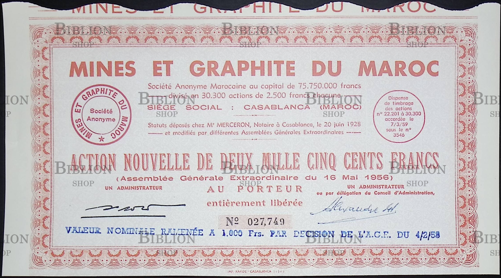 Акция Горнодобывающая промышленность и графит Марокко, 2500 франков 1958 года, Франция