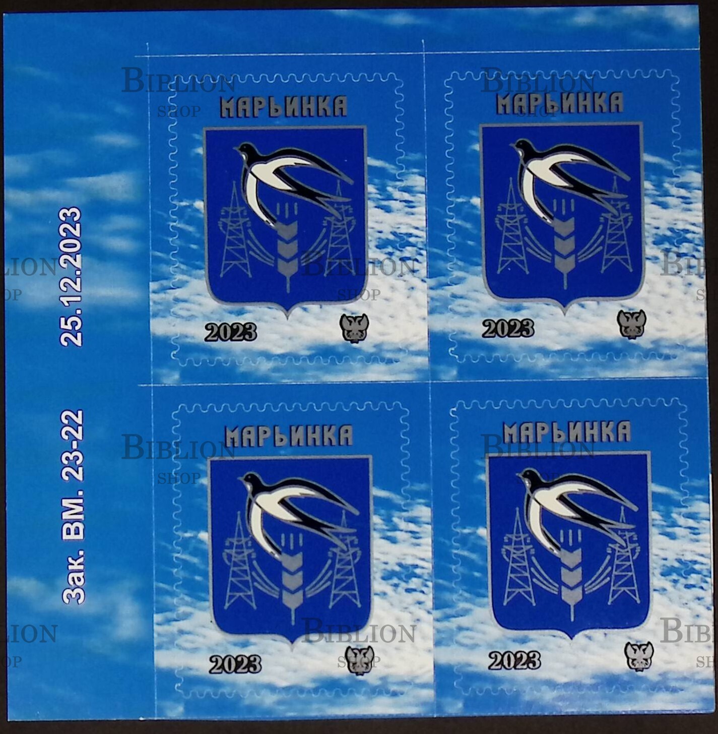 Виньетка выполнена в синем, белом и серебряном цветах. Такое сочетание в геральдике обозначает стремление к победе и справедливости, а также чистоту помыслов и благородство. Виньетка выполнена в стилистике всей данной серии. На ней изображен щит, в центре которого находится символ богатства земли - колос, а рядом в небе парит ласточка, которая олицетворяет собой возрождение и обновление.