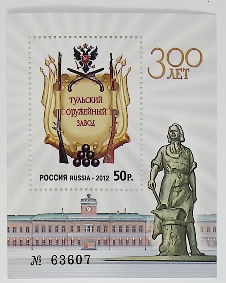 На почтовой марке изображён картуш, посвящённый истории Тульского оружейного завода, на полях блока ― памятник Петру I на фоне здания завода.