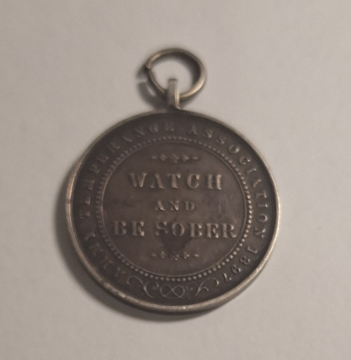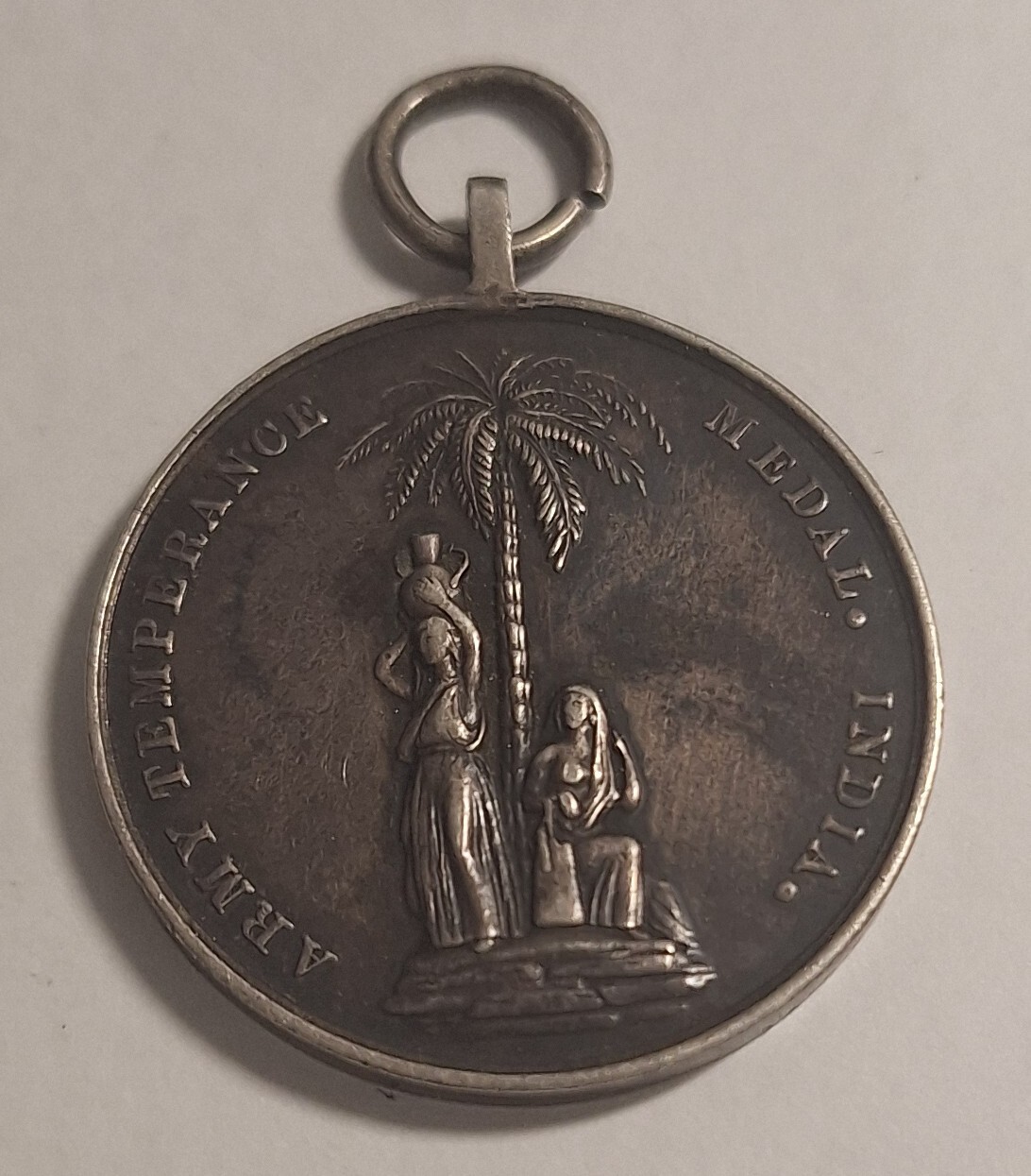 Серебряная медаль Ассоциации трезвости армии Индии 1897 «Смотри и будь трезвым».Медаль вручалась военнослужащим Британской Армии и Британской Индийской Армии за 1 год трезвости. На лицевой стороне изображены две женские фигуры под пальмой и надпись «"Army Temperance Medal. INDIA"» («Медаль за полное воздержание. Индия»);