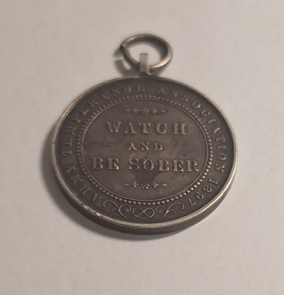 На реверсе медали имеется круговая надпись: "Army Temperance Association. 1897". В центре слова: «WATCH AND BE SOBER», что в приблизительном переводе означает «Будь бдительным и трезвым». Данная фраза является прямой цитатой из Библии и лозунгом Ассоциации полного воздержания. В первом послании Святого Апостола Павла к Фессалоникам говориться, что Страшный Суд может произойти в любой момент, поэтому надо «бодрствовать и быть трезвым».