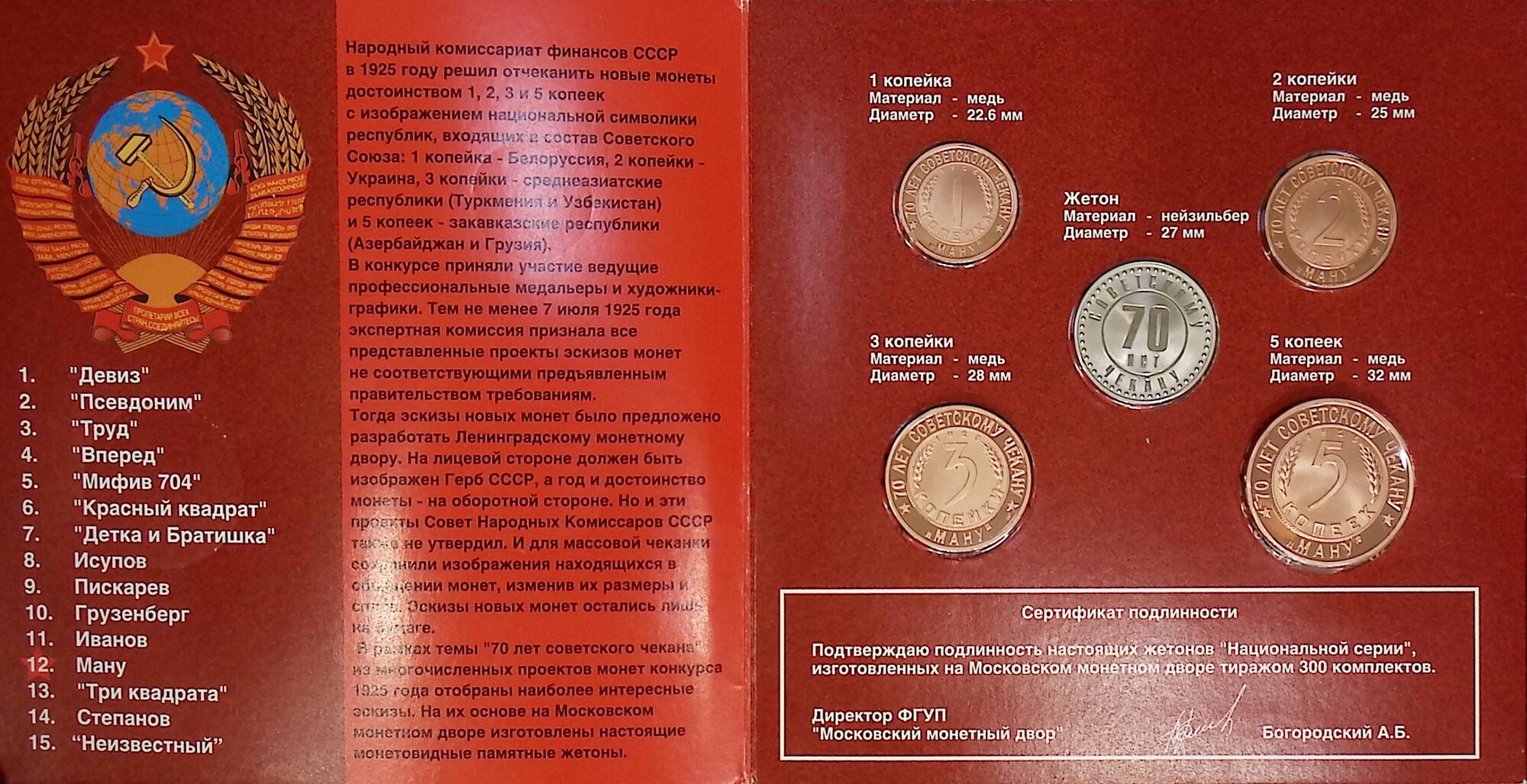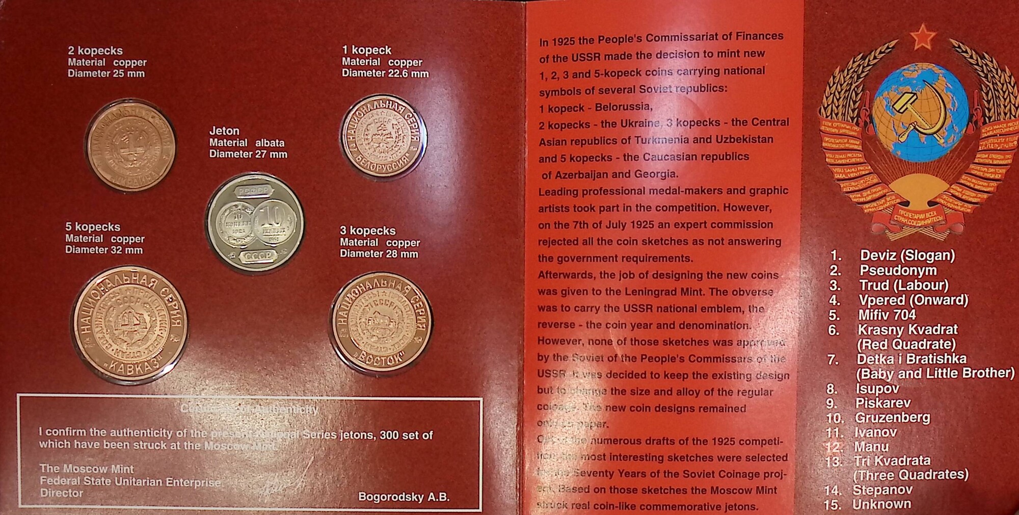 В полный комплект монетовидных жетонов «70 лет Советскому чекану - Национальная серия» входило 15 наборов в буклетах (в буклете монета 1 копейка, 2 копейки, 3 копейки и 5 копеек, выполненные по эскизам конкурса 1925 года): «Девиз», «Псевдоним», «Труд», «Вперед», «Мифив 704», «Красный квадрат», «Детка и Братишка», «Исупов», «Пискарев», «Грузенберг», «Иванов», «Ману», «Три квадрата», «Степанов», «Неизвестный».