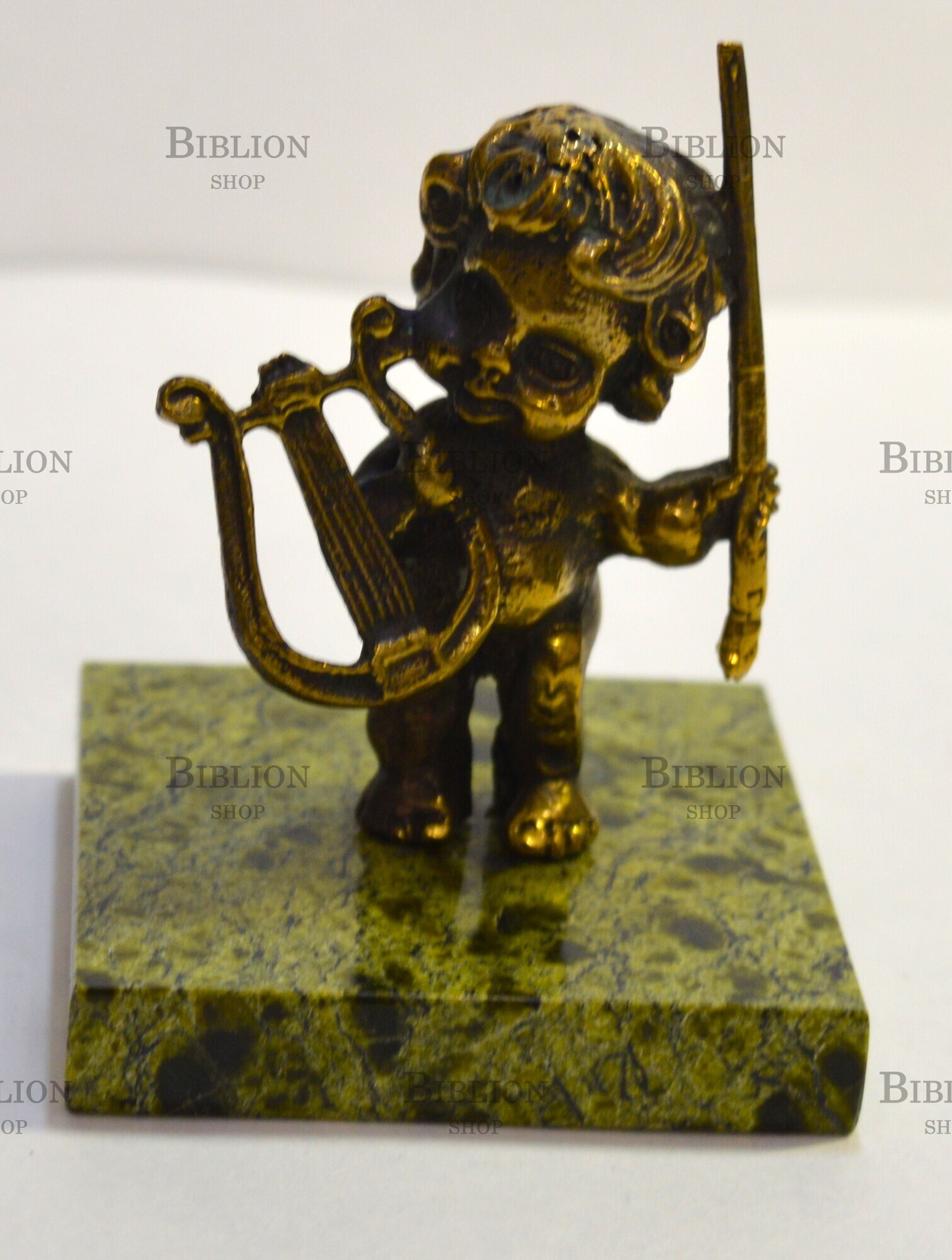 Главная Интернет-магазин Подарки.Сувениры Сувениры Статуэтка из бронзы "Ангелочек с арфой на подставке из змеевика (Змеевик,бронза)